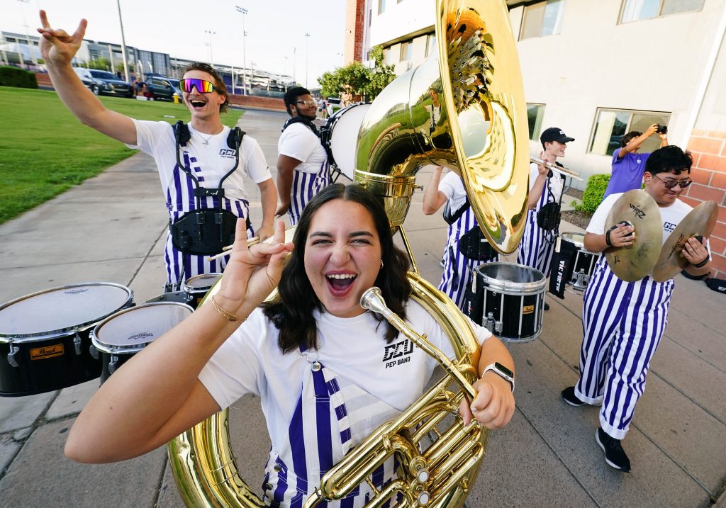 Tuba player Arianna Darling and the Thundering Heard Pep Band at the Grove during Welcome Week’s Monday student move-in on Aug. 25, 2025. -