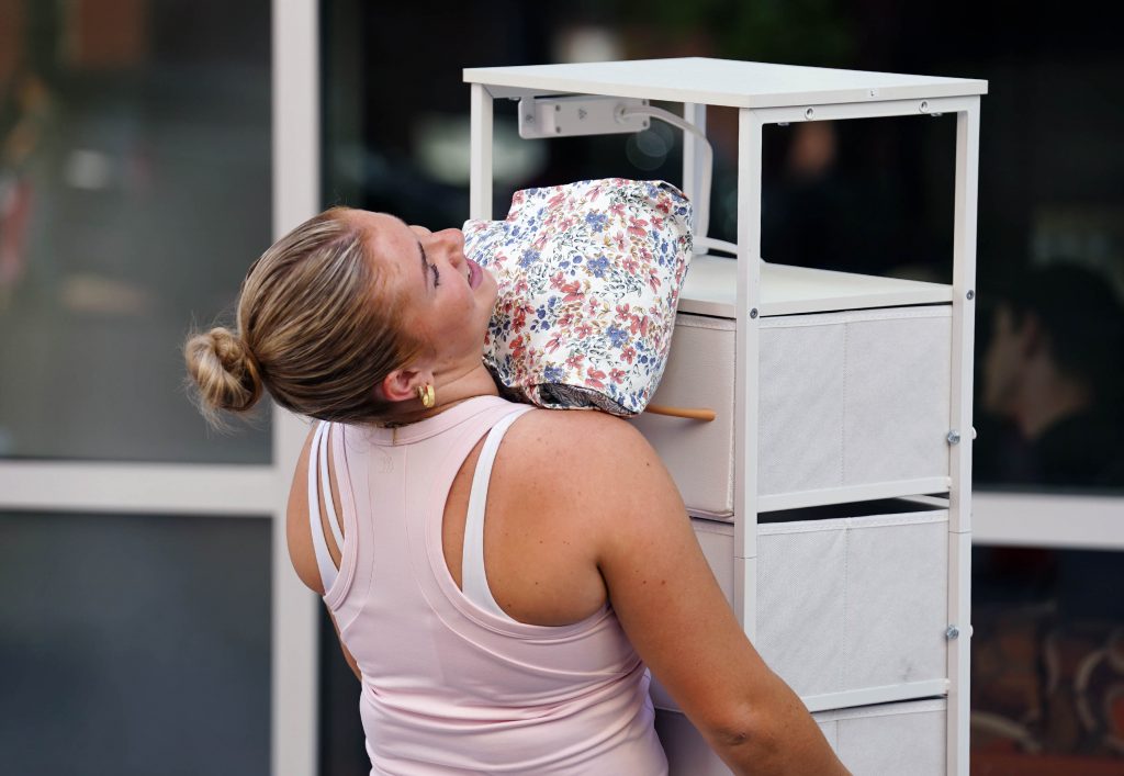 A student tries to balance an item as she carries belongings to her apartment during Welcome Week’s Monday student move-in on Aug. 25, 2025. -