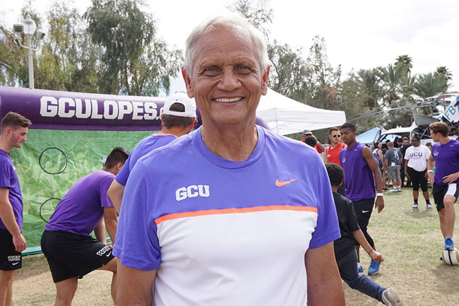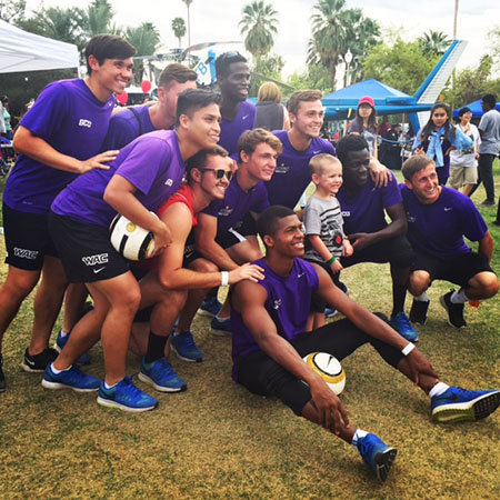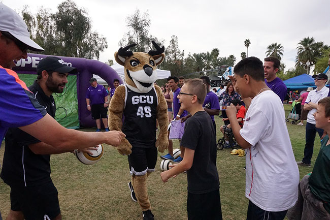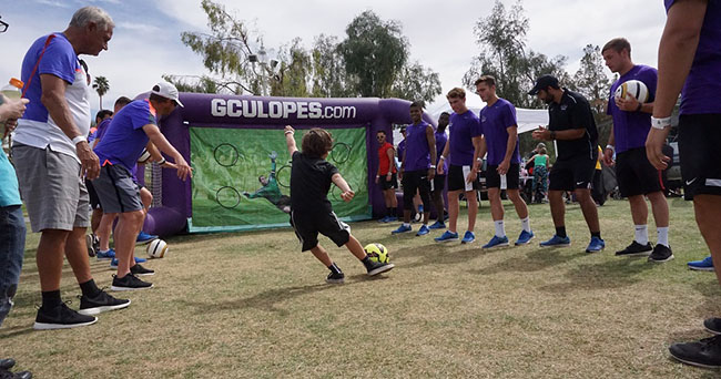 And in the midst of the crowd, the smell of grilled hot dogs and upbeat music came the sound of Grand Canyon University’s men’s soccer team, cheering on a group of youngsters as they lined up one by one to kick soccer balls into a large, inflatable soccer goal.