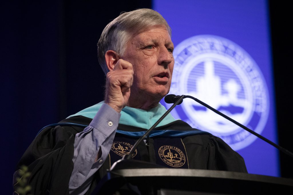 GCU President Brian Mueller addresses graduates at the Thursday afternoon, May 1, 2025, commencement ceremony at Global Credit Union Arena. -