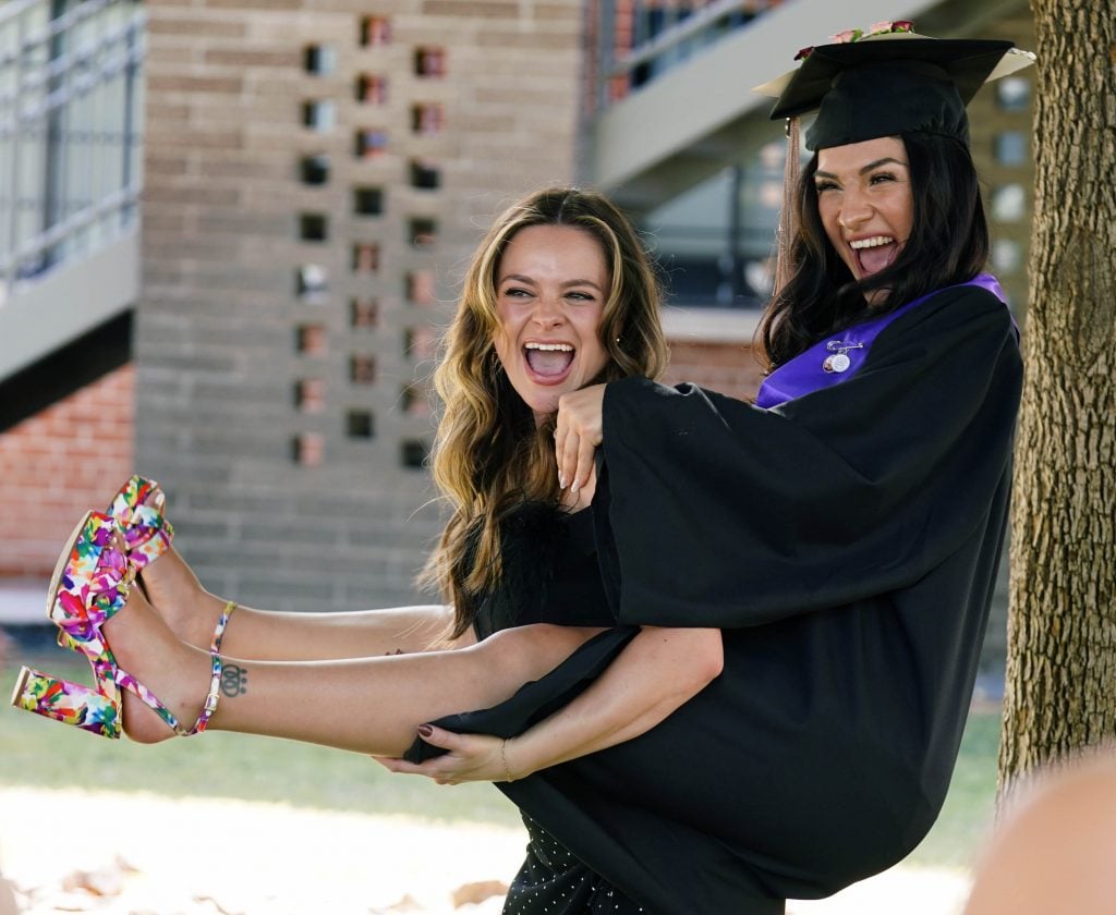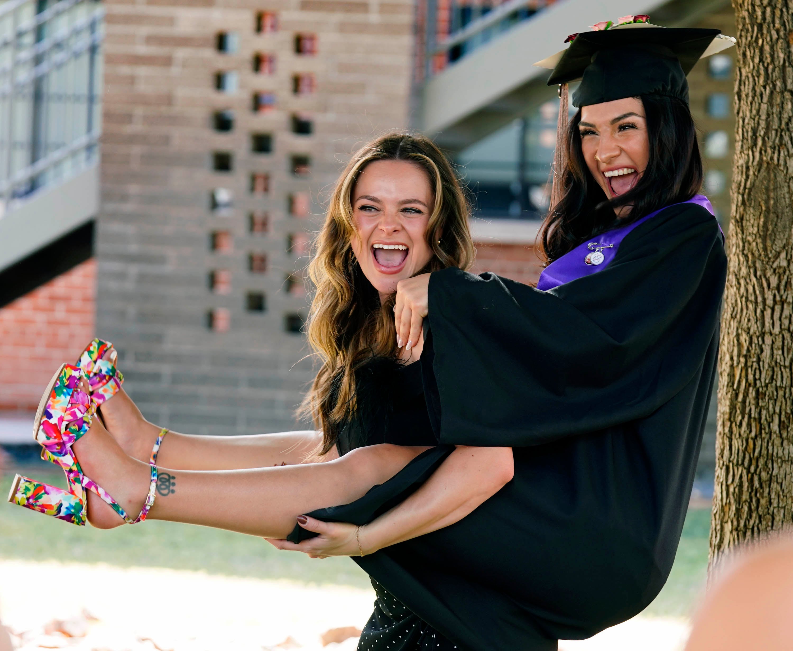 A graduate gets a lift from a friend to show off her shoes during the Tuesday commencement ceremony for online students at Global Credit Union Arena. -