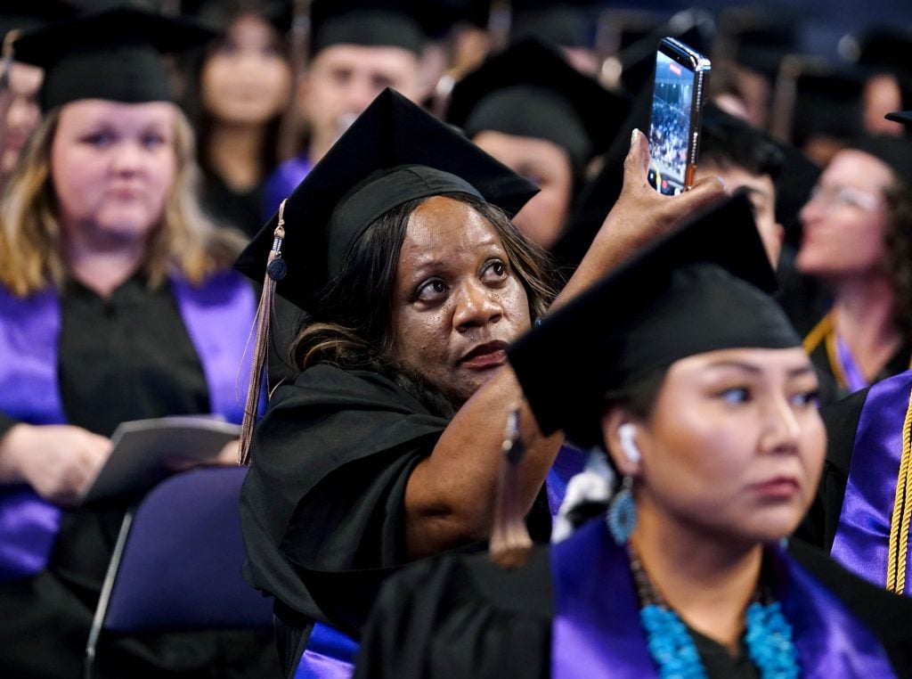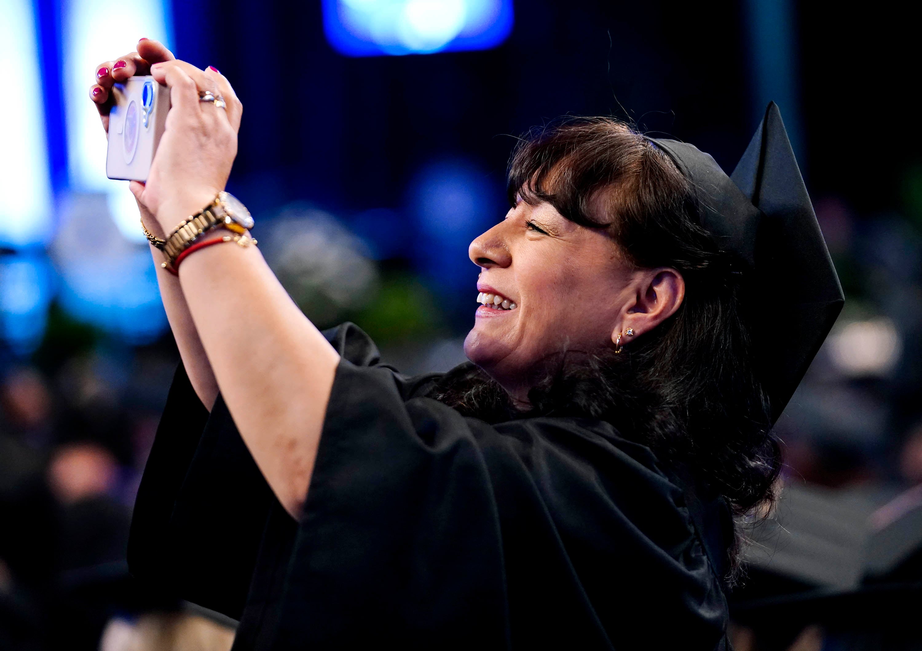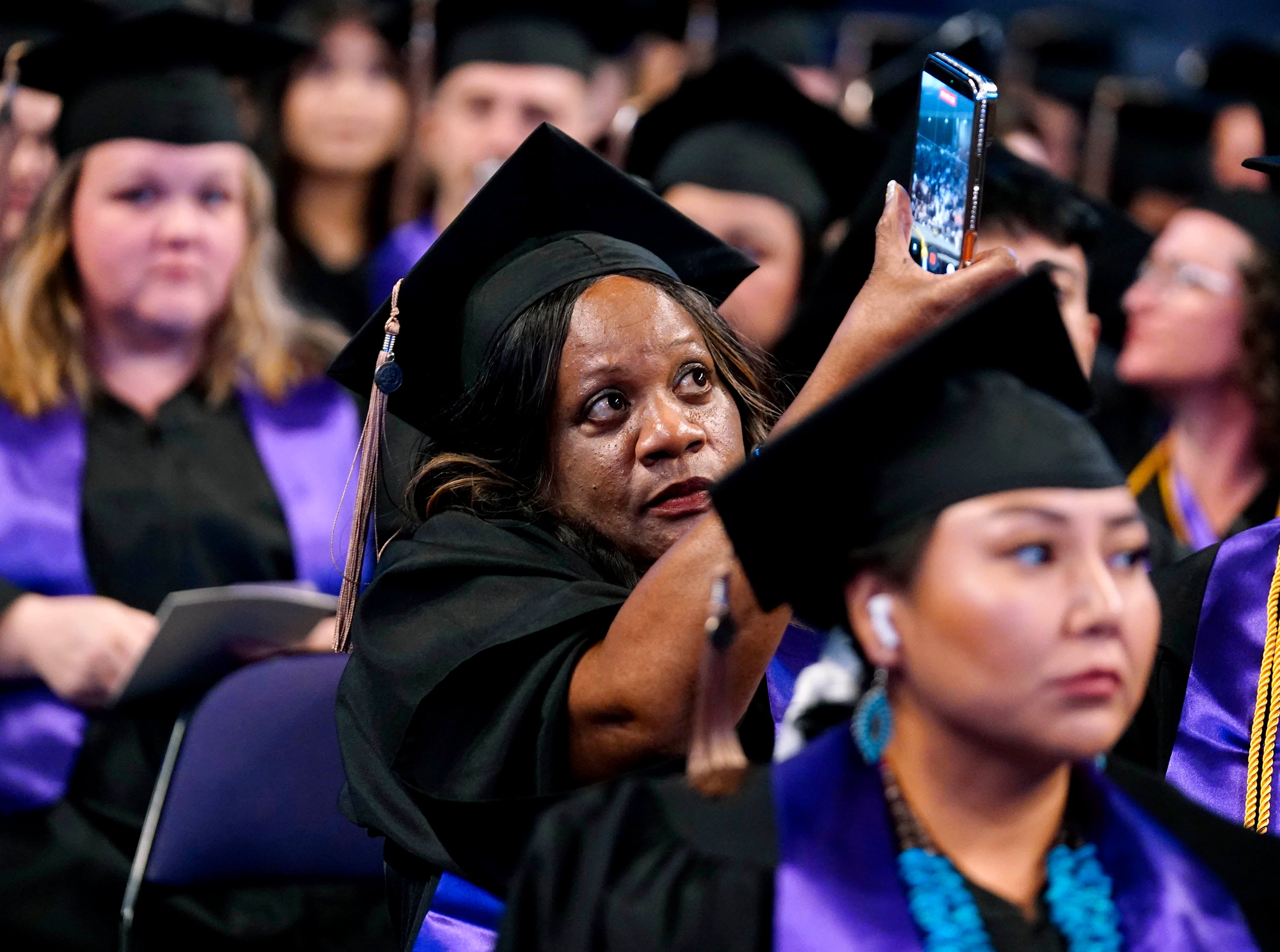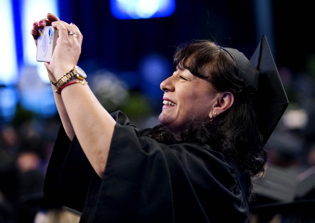 A graduate takes pictures during the Tuesday commencement ceremony for online students at Global Credit Union Arena. -