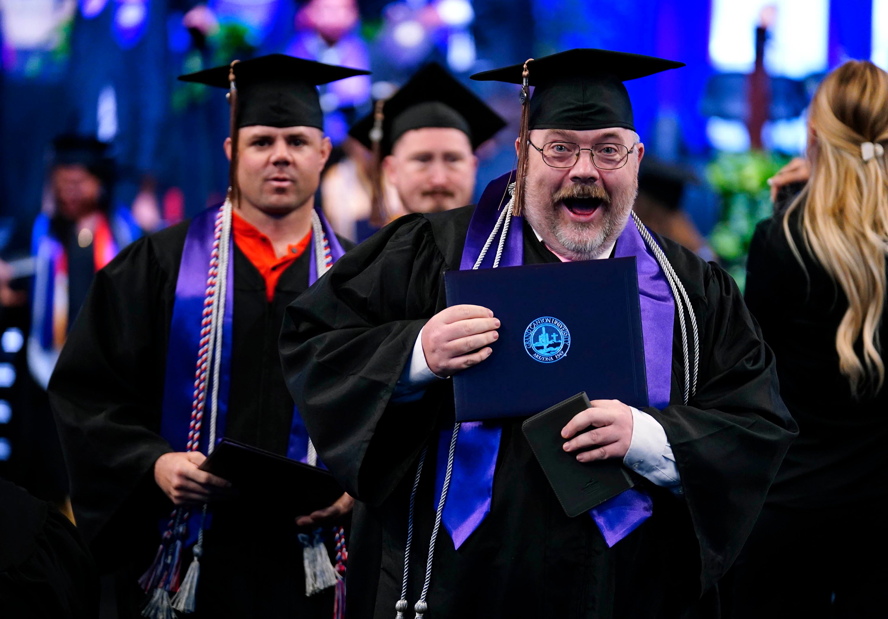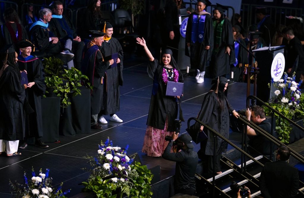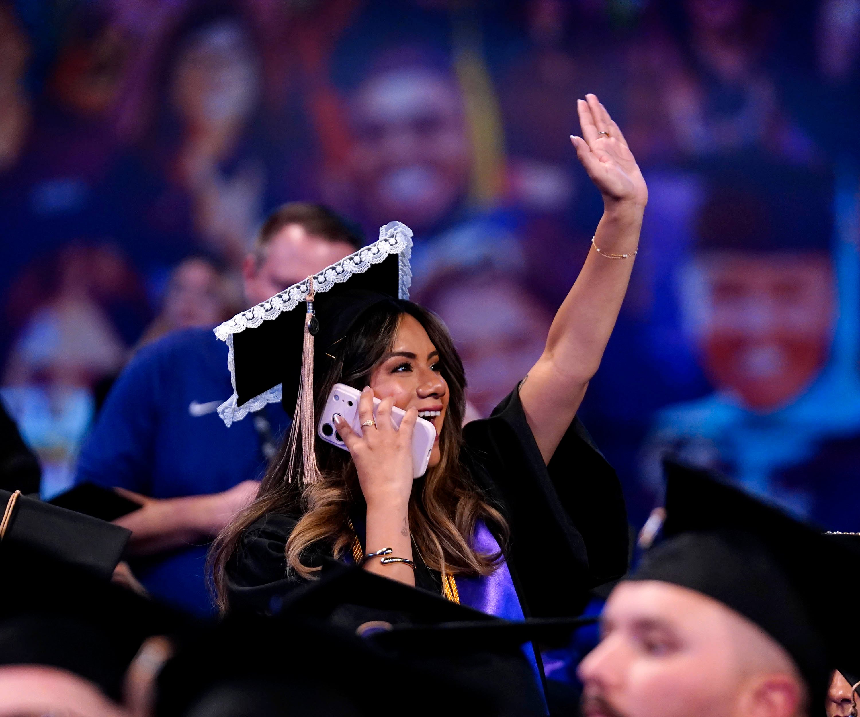 Graduates wave to family and friends in the crowd after receiving their diploma during the Tuesday commencement ceremony for online students. -