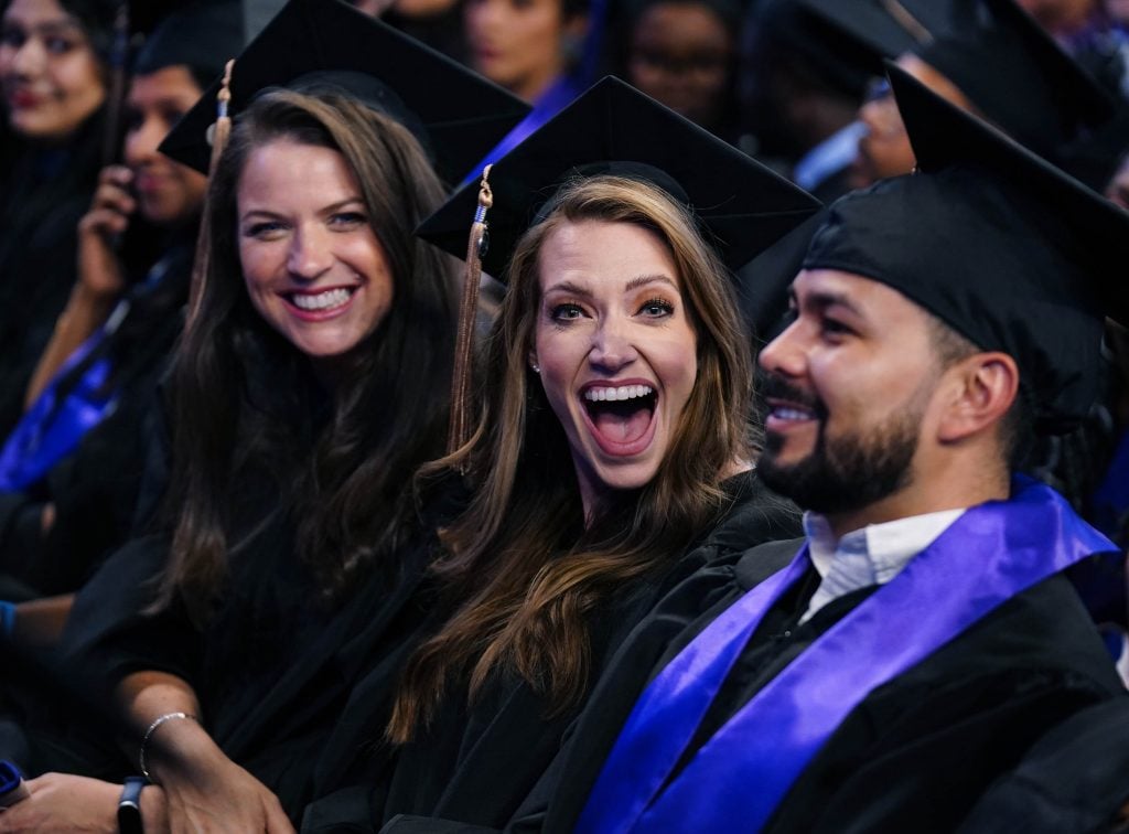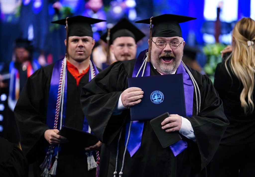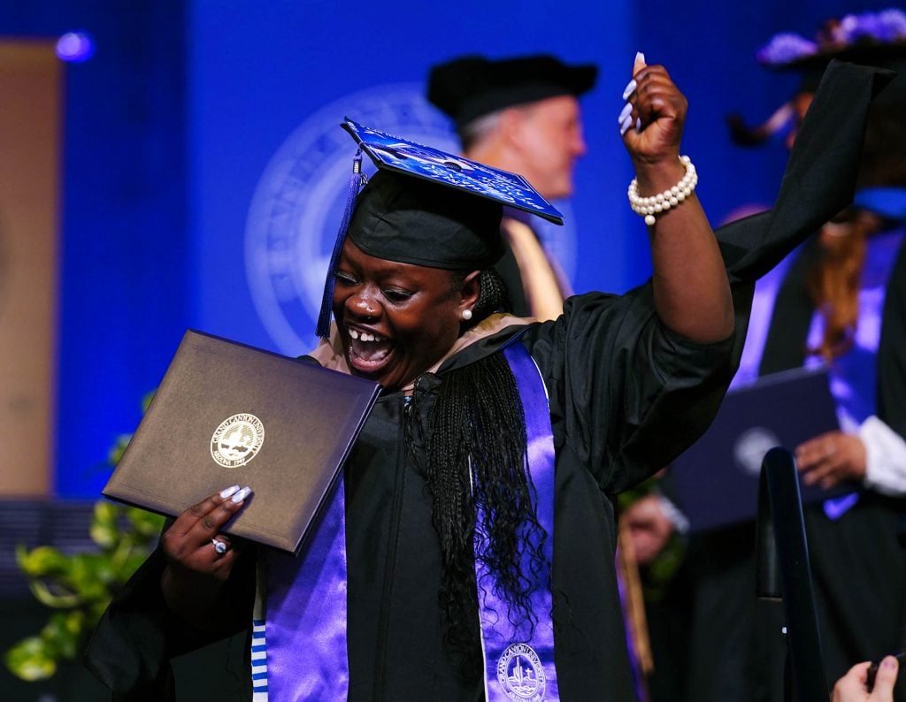 Graduates celebrate after receiving their diploma during the Tuesday commencement ceremony for online students. -