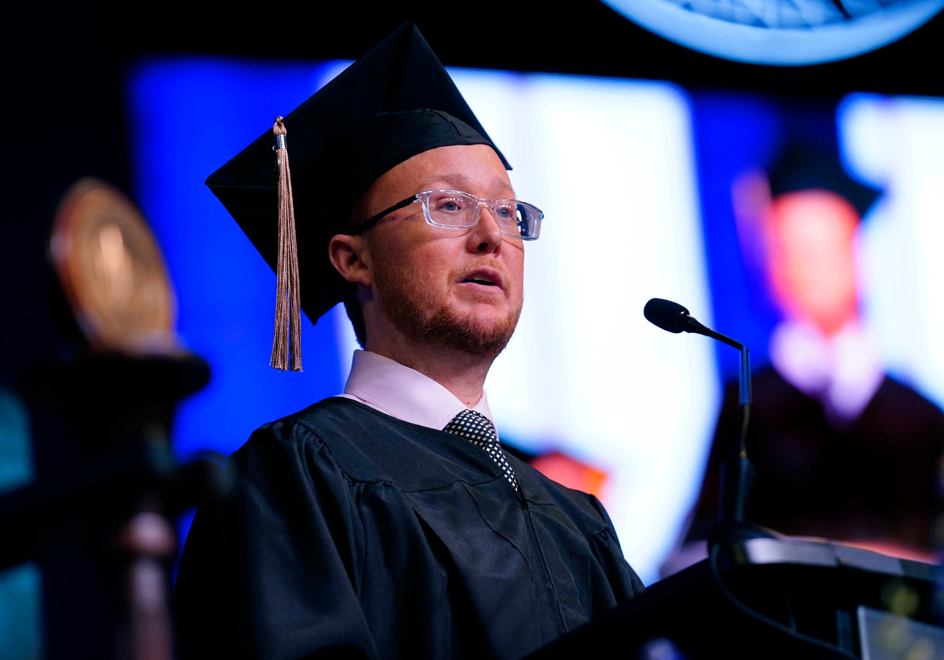 Student speaker Collin Buford addresses his fellow graduates during the Tuesday commencement ceremony for online students. -