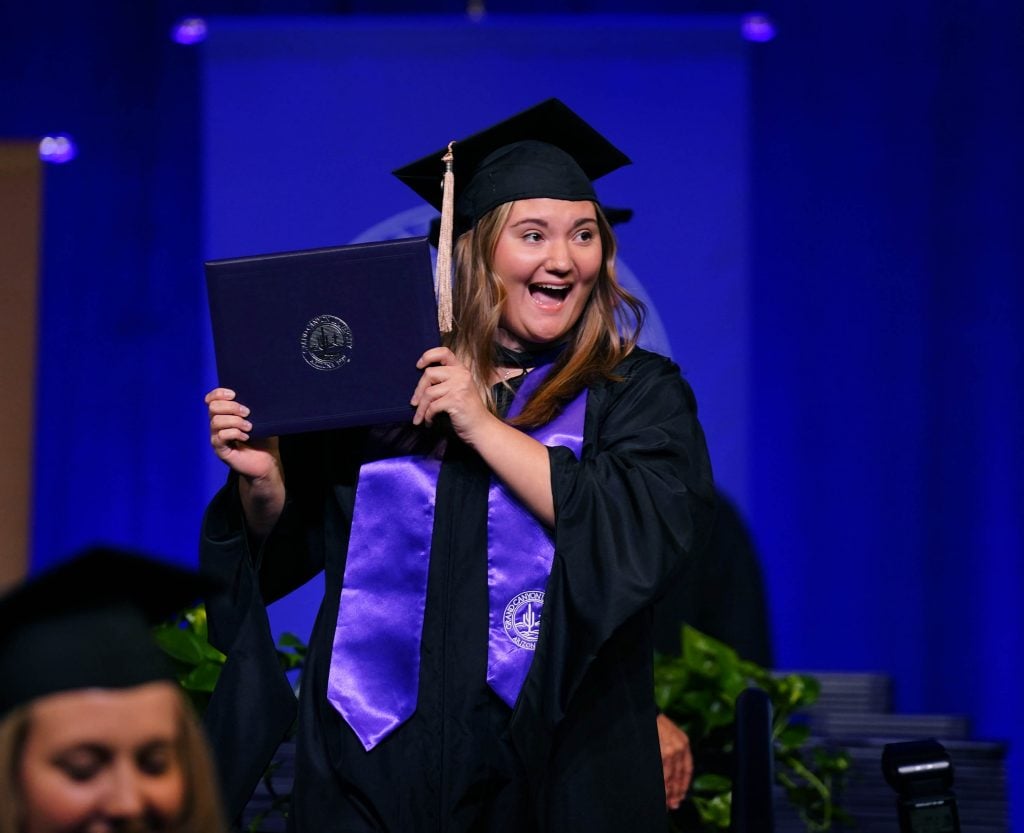 An online graduate with her diploma following the Tuesday commencement ceremony for online students.