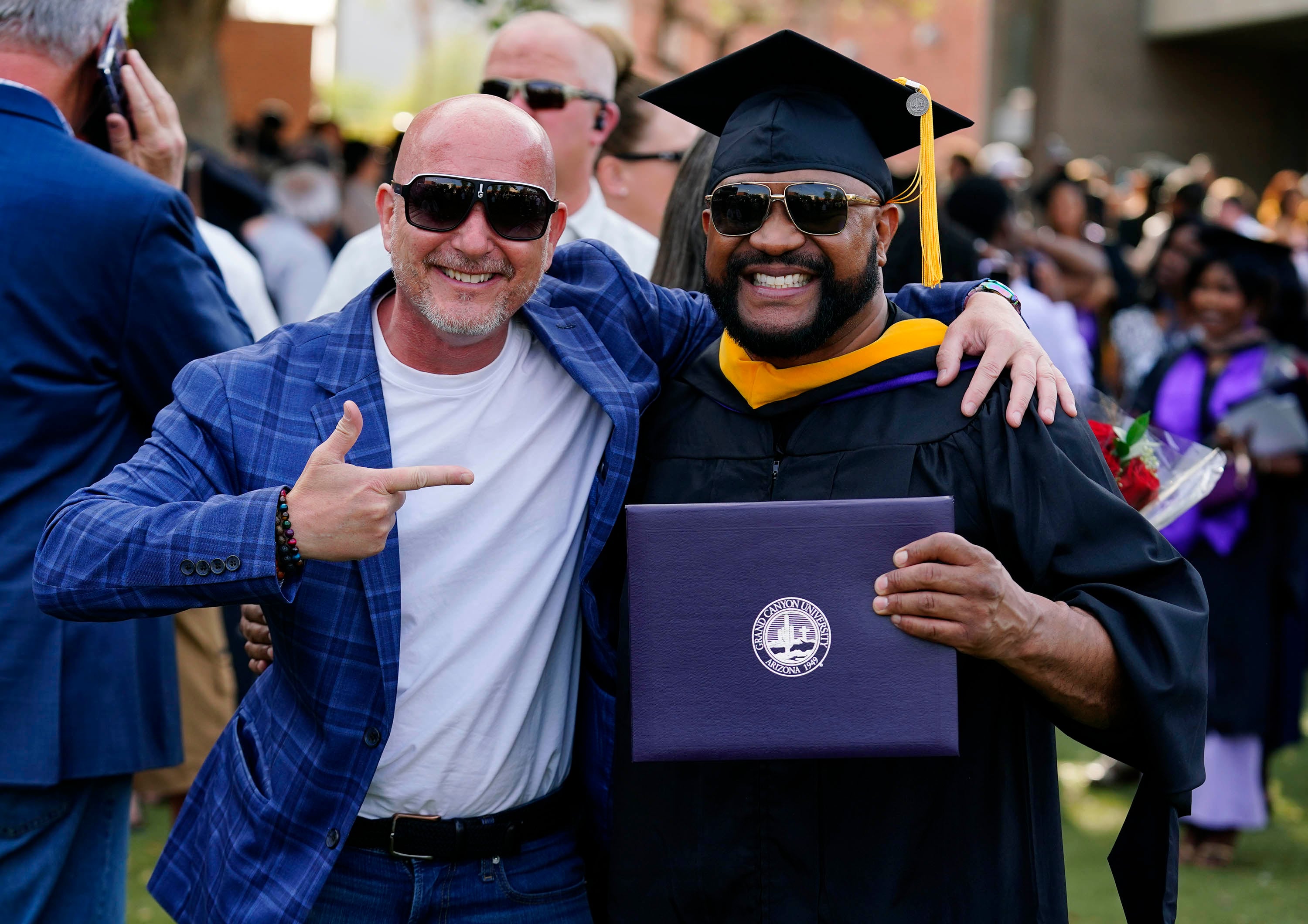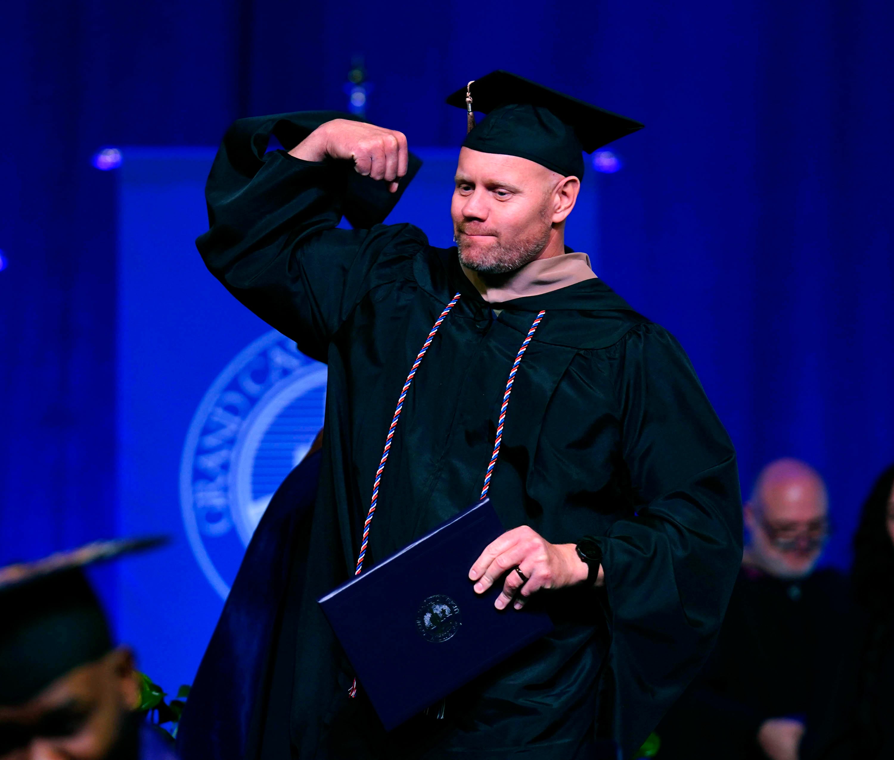 A graduate flexes some muscle after receiving his diploma during the Tuesday commencement ceremony for online students. -