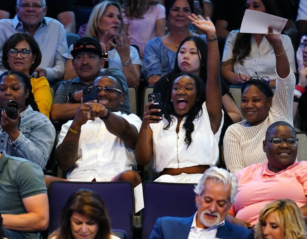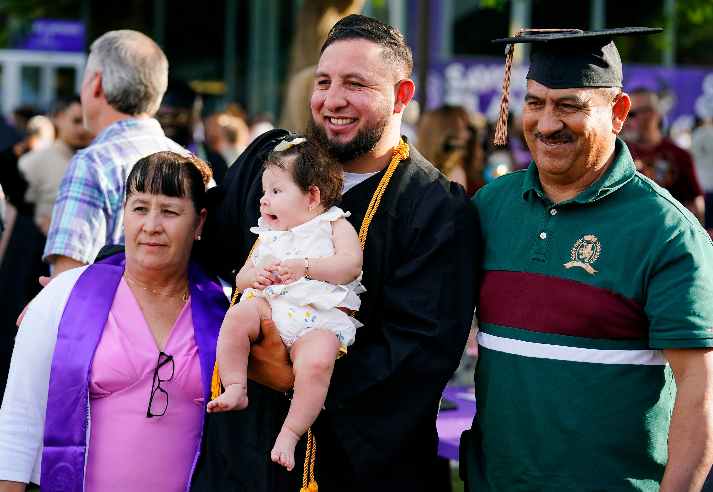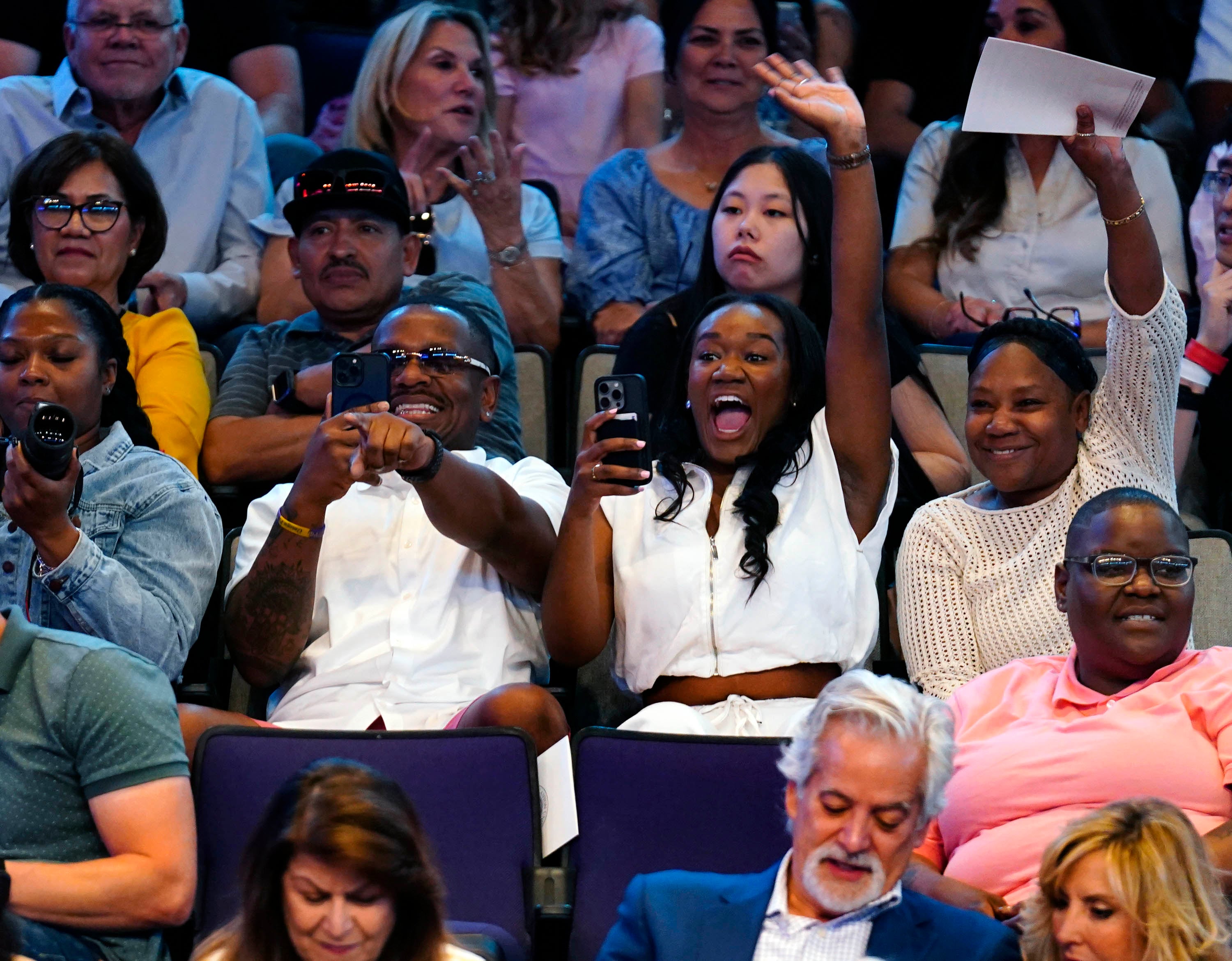 Family members cheer on their graduate during the Tuesday commencement ceremony for online students. -