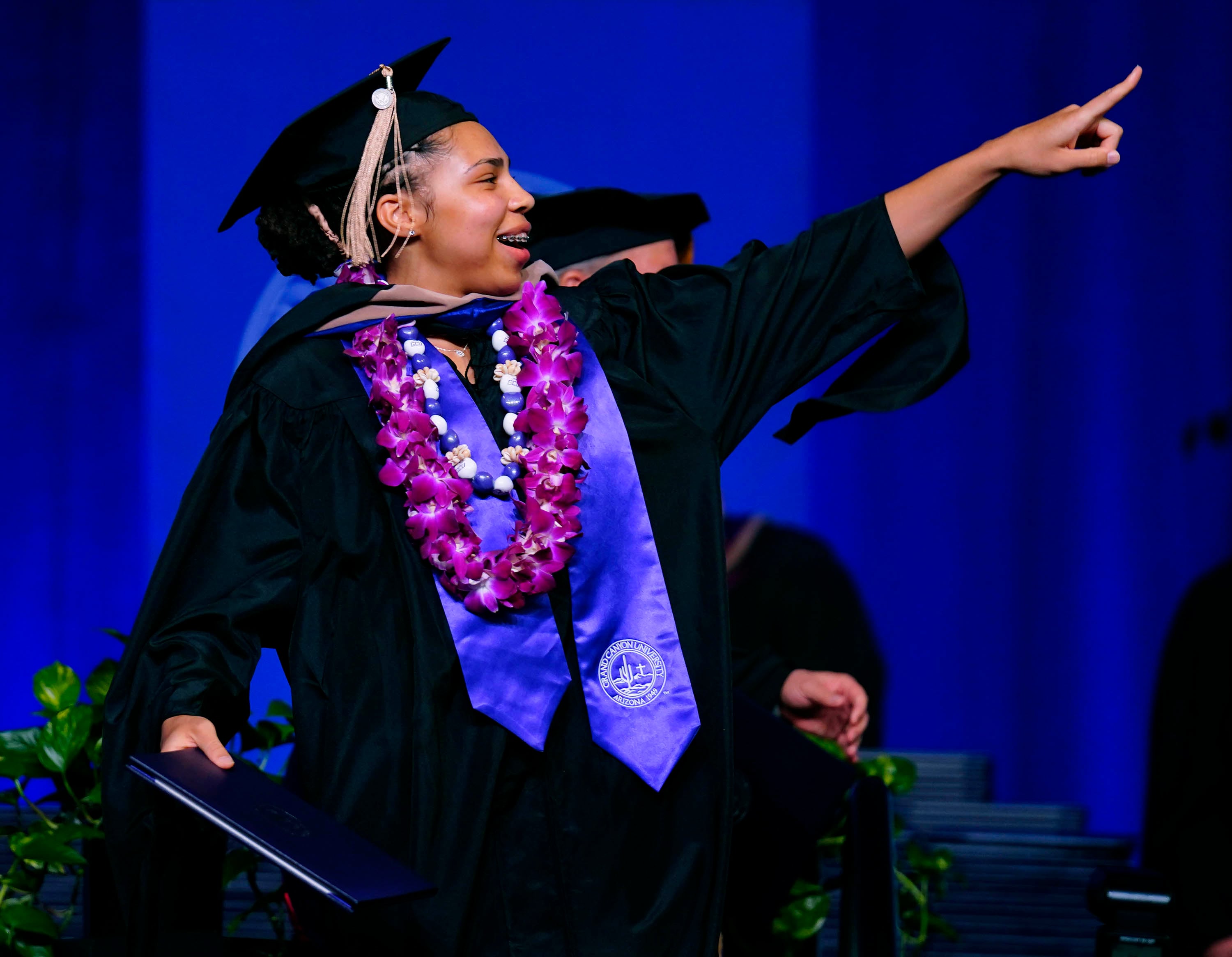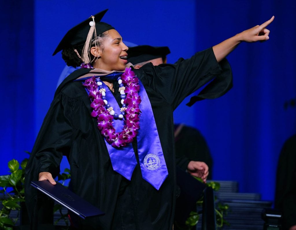 Graduates point to family and friends after receiving their diploma during the Tuesday commencement ceremony for online students. -