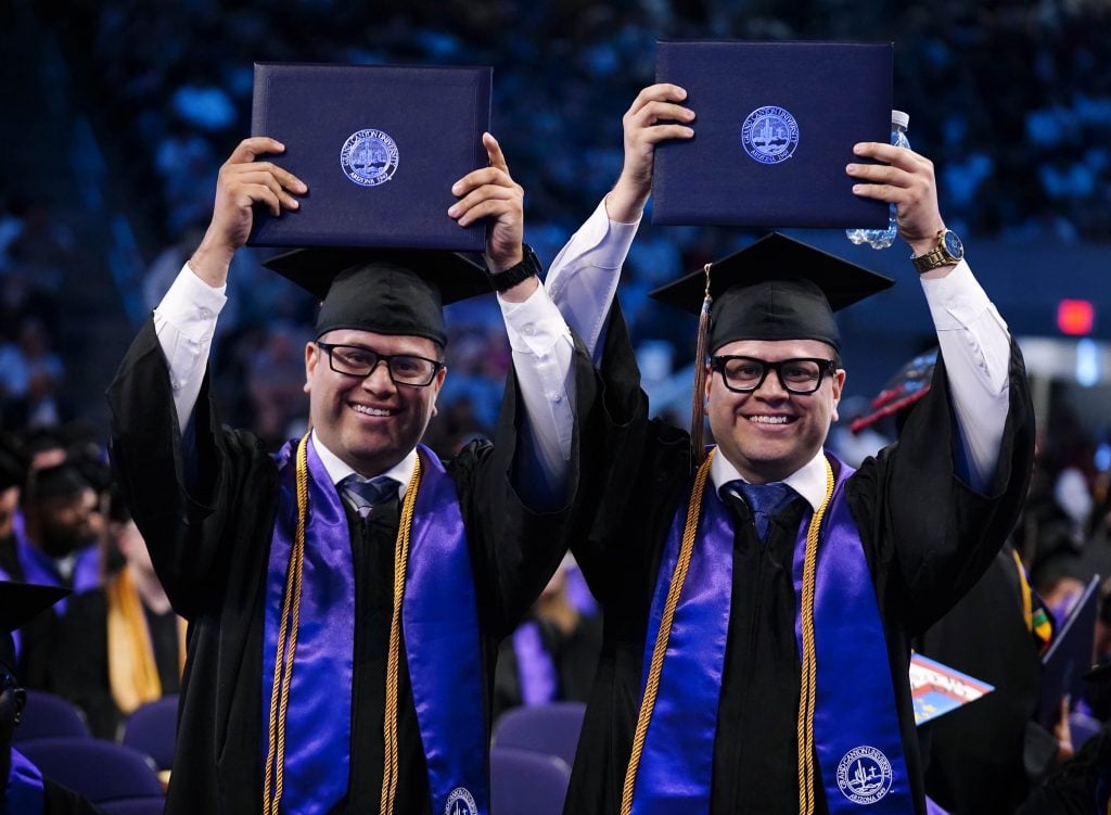 The day was twice as nice for a pair of identical twins as they hold up their diplomas during the Tuesday commencement ceremony for online students. -