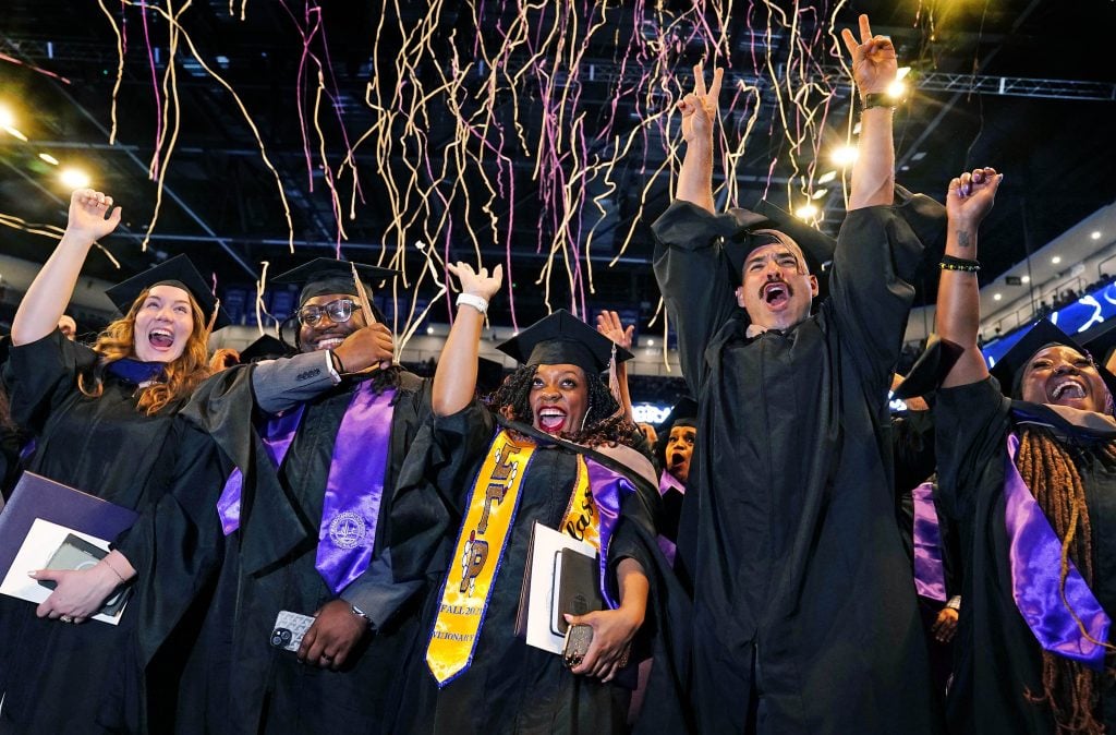 Graduates celebrate under a shower of confetti streamers during the Tuesday commencement ceremony for online students. -