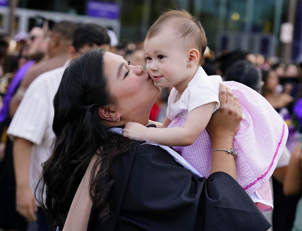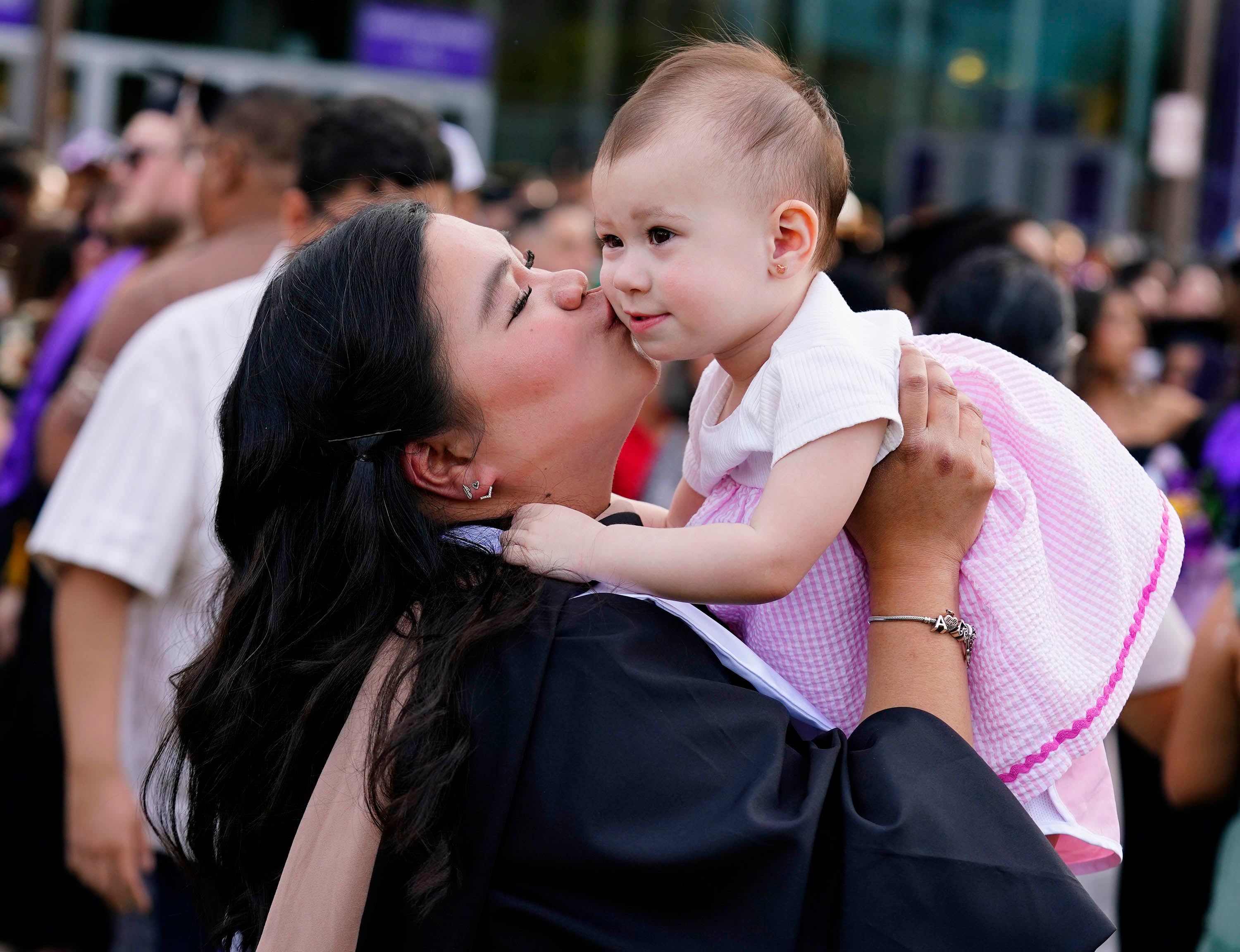 A graduate kisses her 18 month-old daughter following the Tuesday commencement ceremony for online students. -