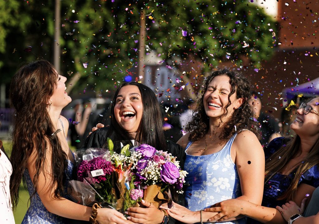 Confetti rains down on a graduate and her friends as they celebrate on the Quad following the Tuesday commencement ceremony for online students. -