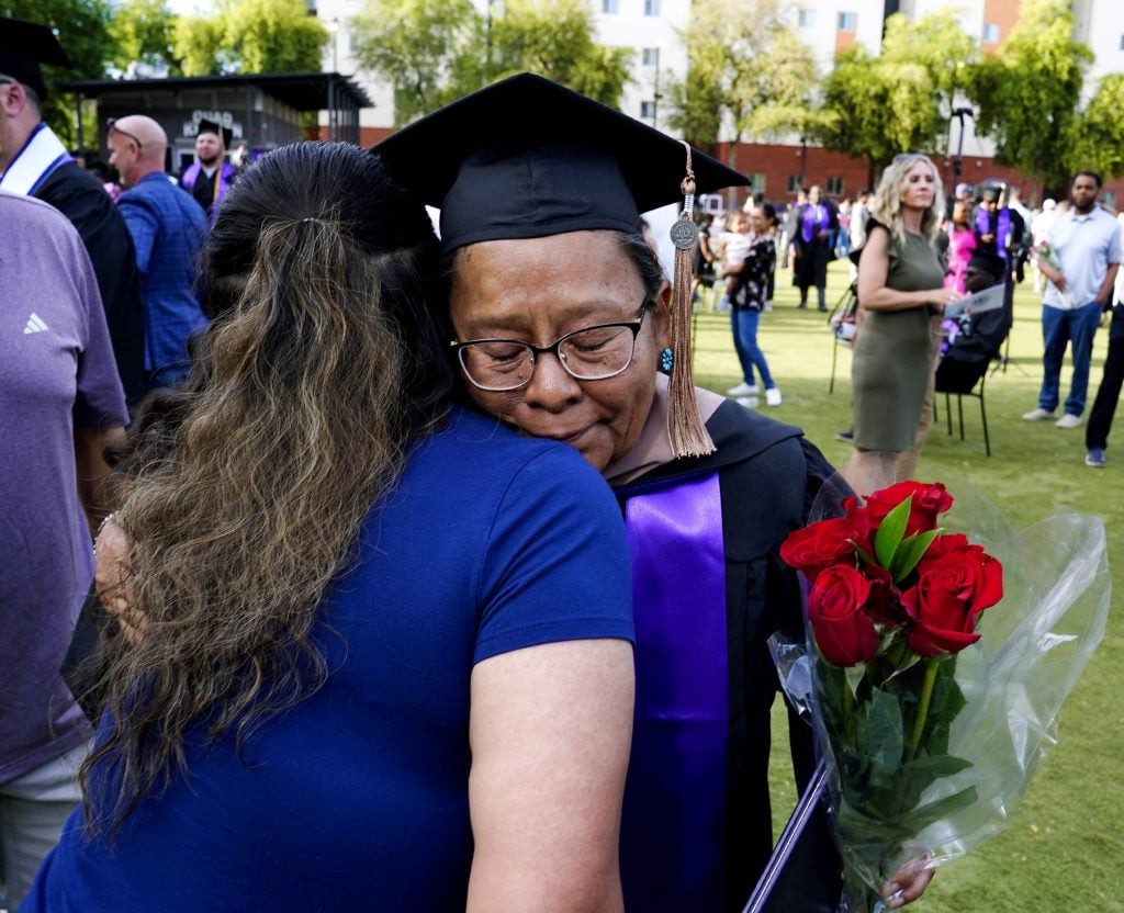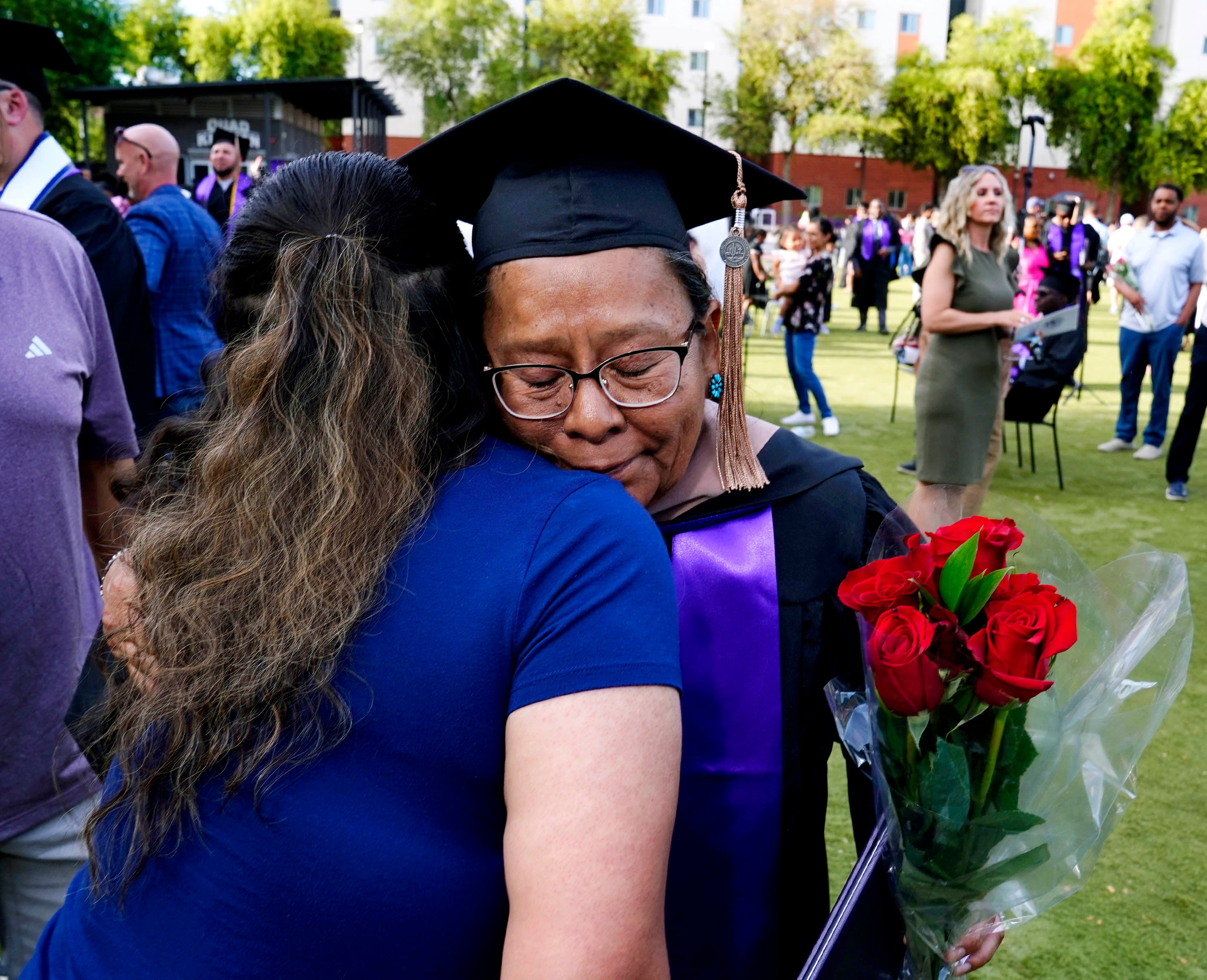 A graduate is greeted with hugs and flowers from a family member following the Tuesday commencement ceremony for online students at Global Credit Union Arena. -