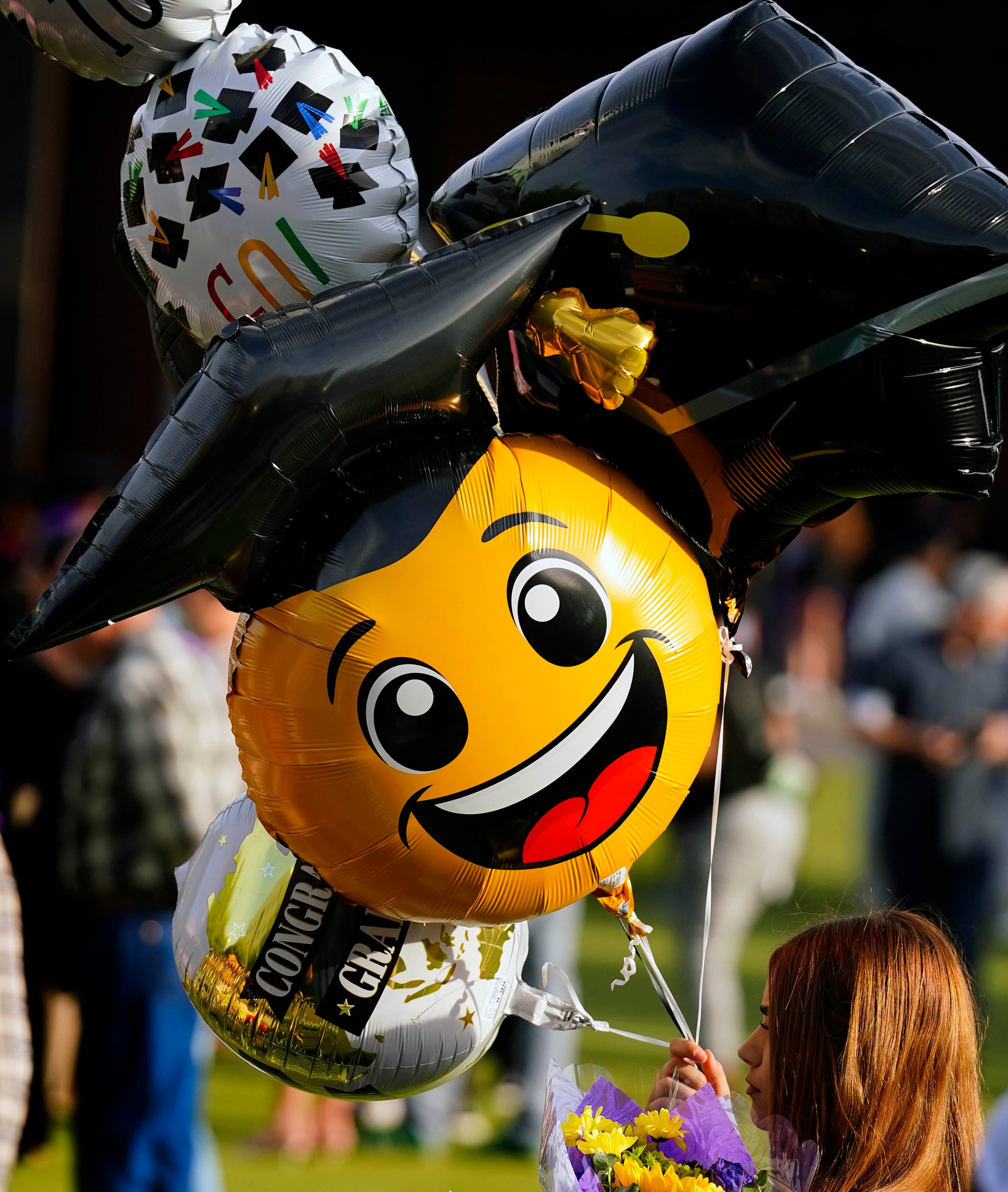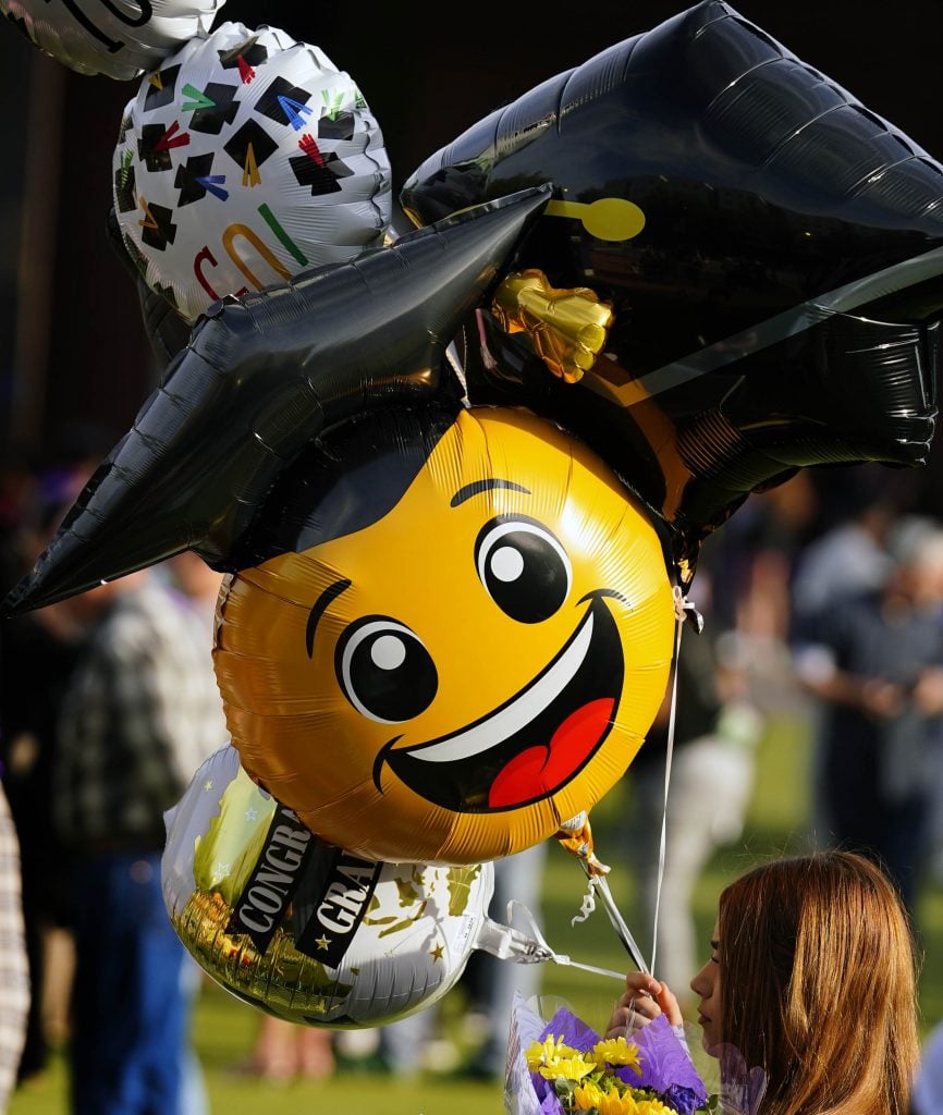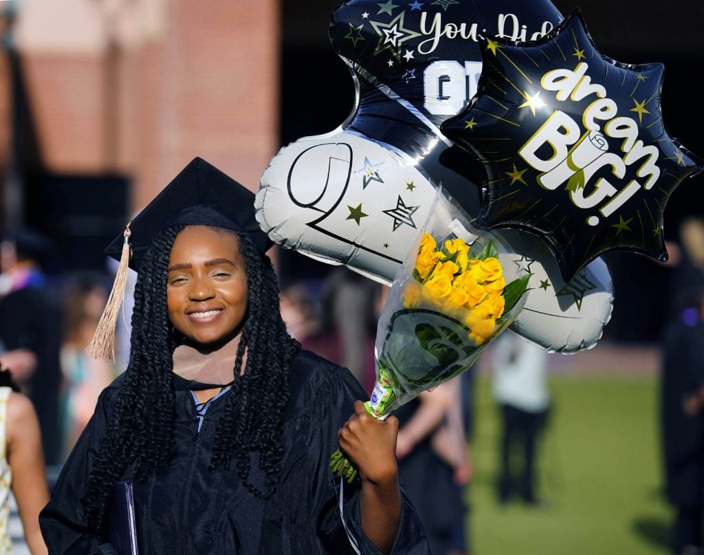 A graduate with balloons following the Tuesday commencement ceremony for online students at Global Credit Union Arena. -