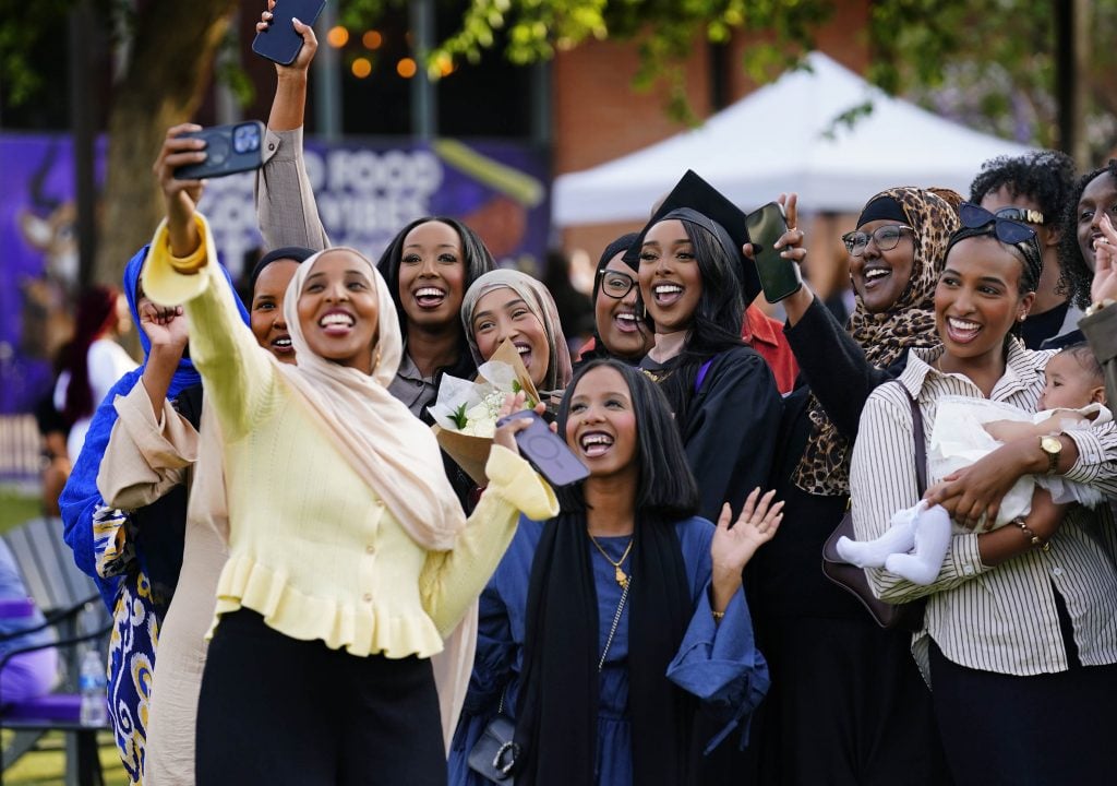Graduates take selfies with family and friends on the Quad following the Tuesday commencement ceremony for online students. -