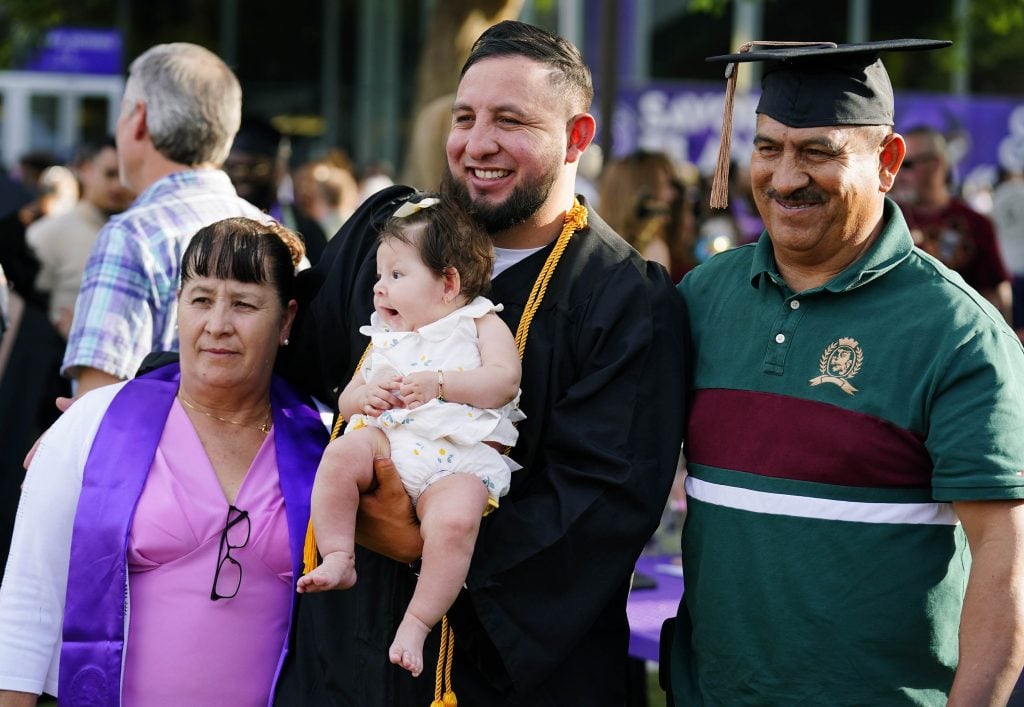 Graduates take photos with family members on the Quad following the Tuesday commencement ceremony for online students. -