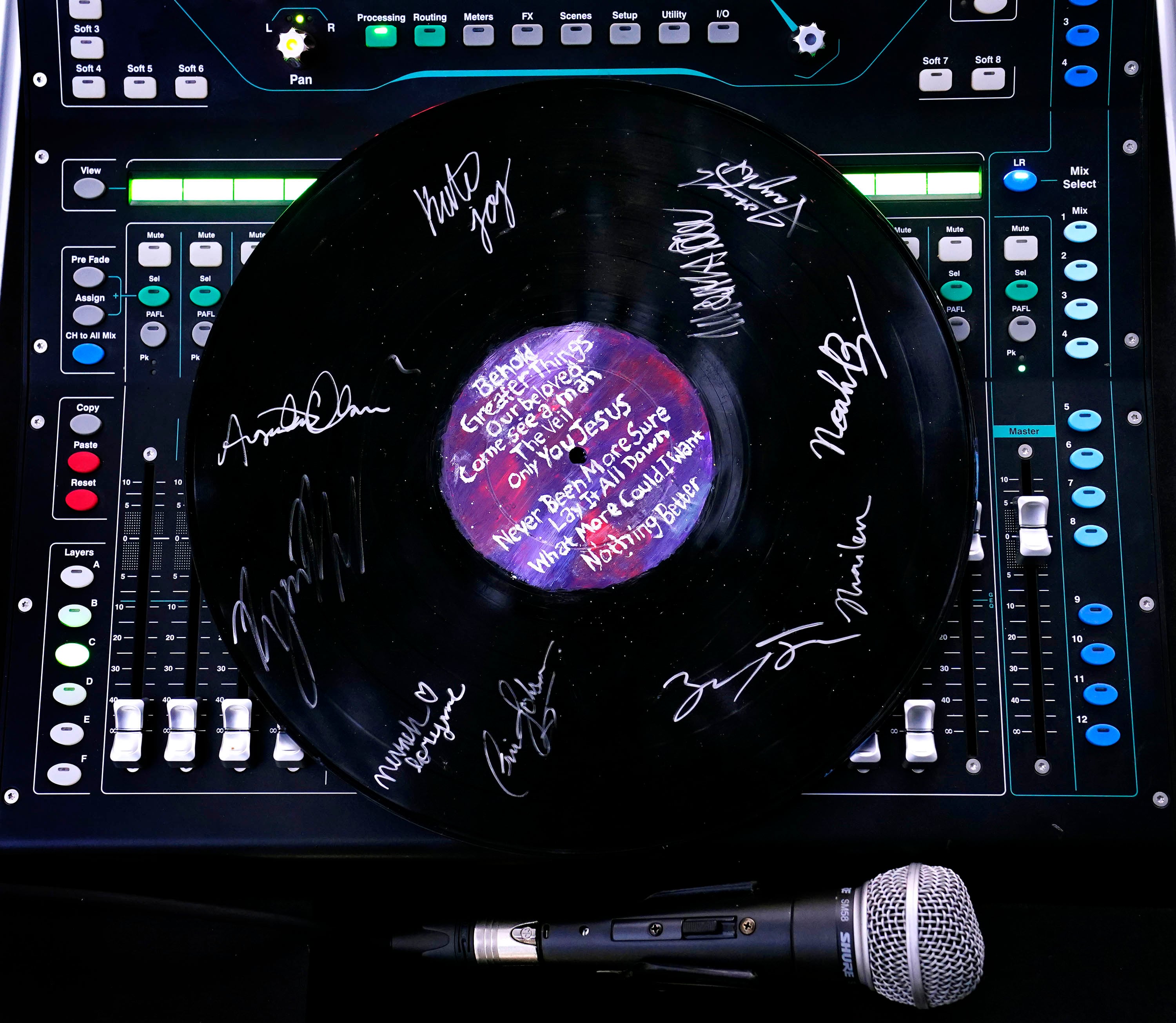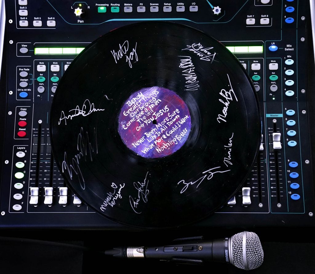 A painted vinyl album representing Canyon Worship X Live, featuring the signatures of artists on the release, sits on the sound board during the Songwriters Showcase. April 20, 2026. -