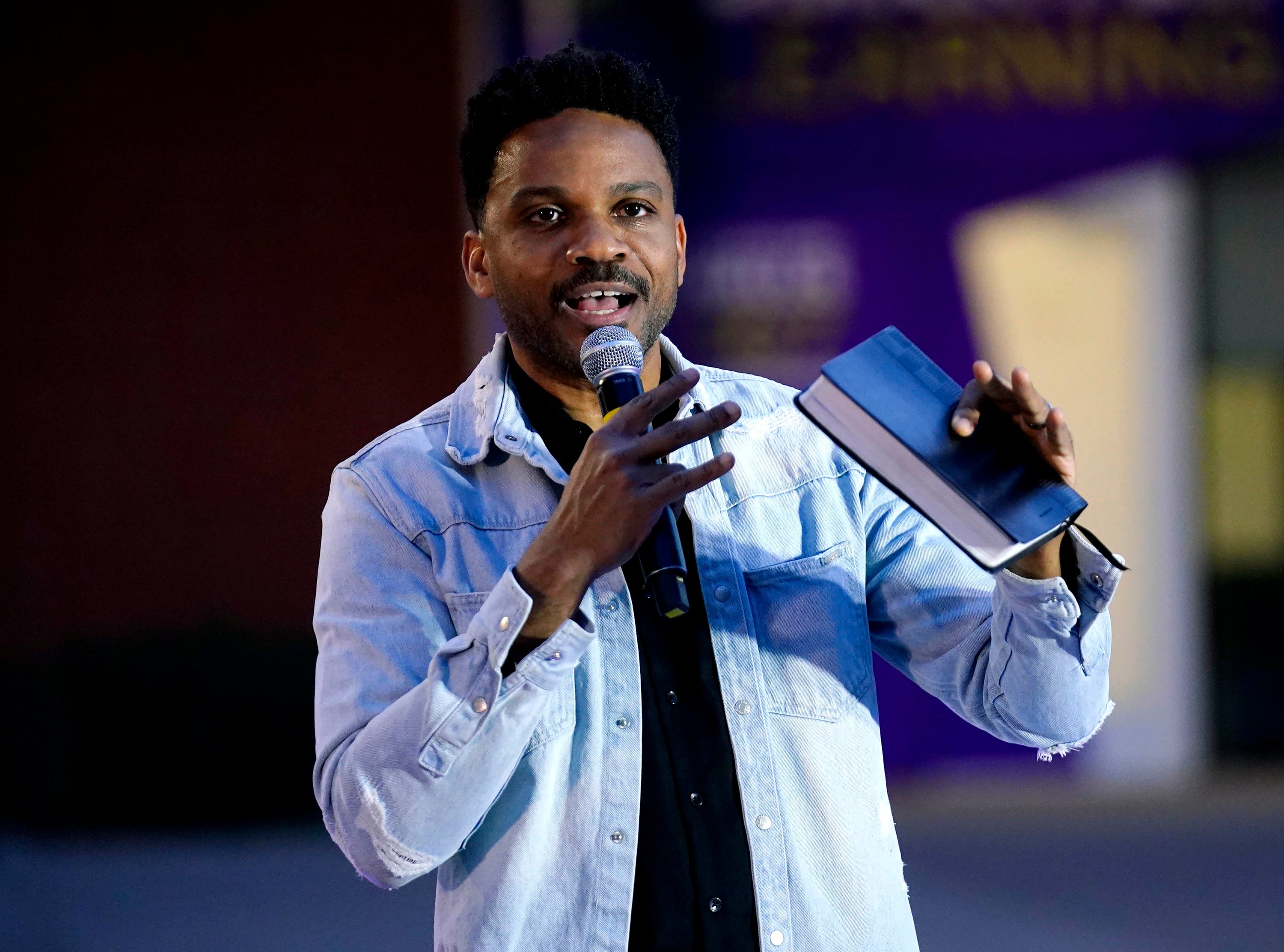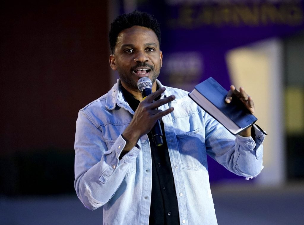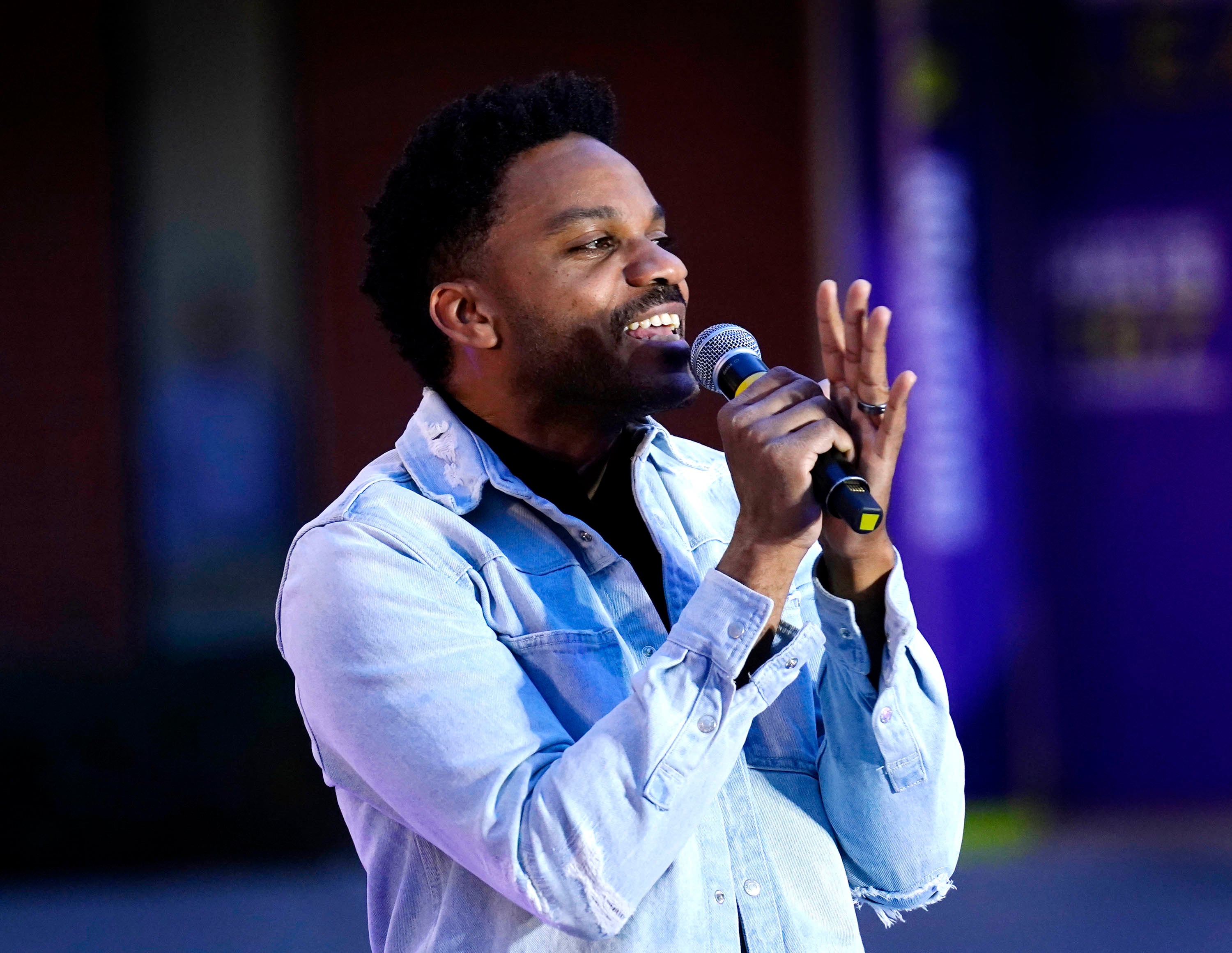 Director of Worship Arts Moises Felipe welcomes students and guests to the Songwriters Showcase at the Engineering Building courtyard. April 20, 2026. -