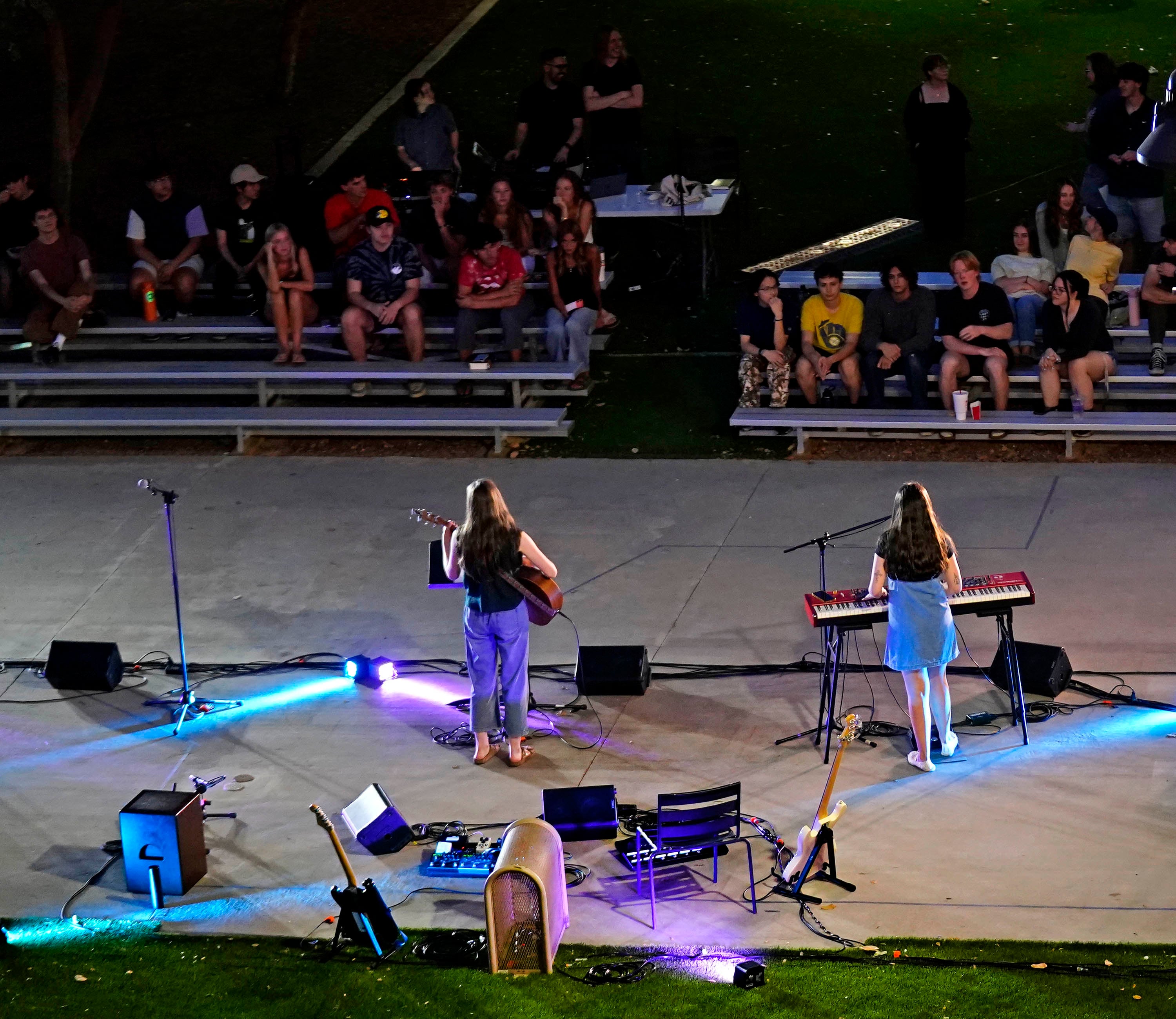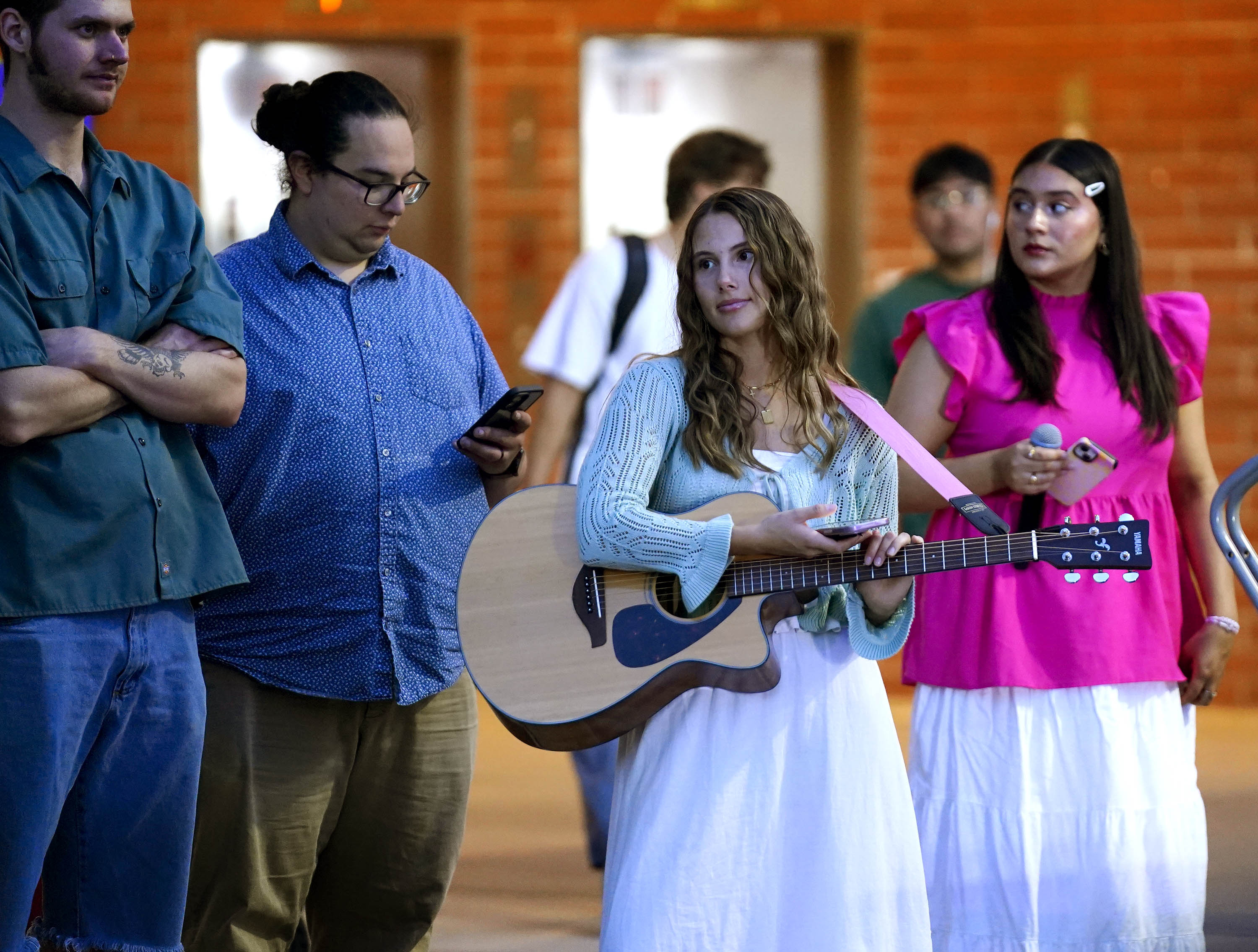Student songwriters, such as Nevaeh Watkins, wait off stage for their time to play during the Songwriters Showcase at the Engineering Building courtyard. April 20, 2026. -