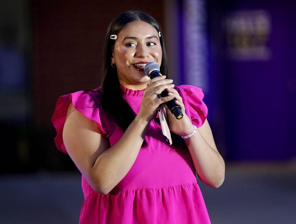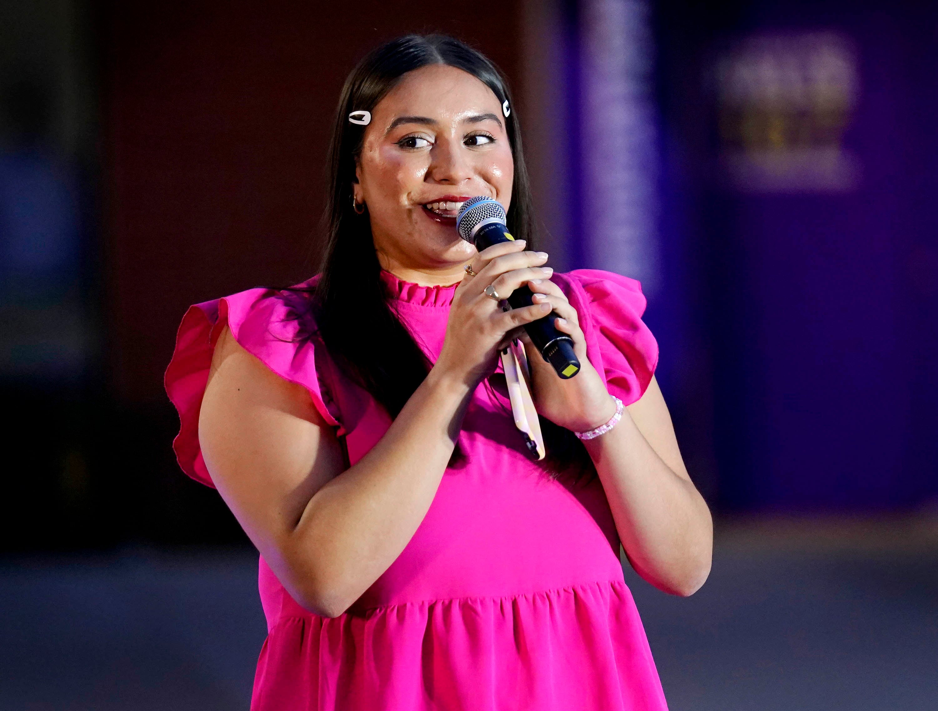 Event host Vanessa Torres introduces student songwriters during the Songwriters Showcase at the Engineering Building courtyard. April 20, 2026. -