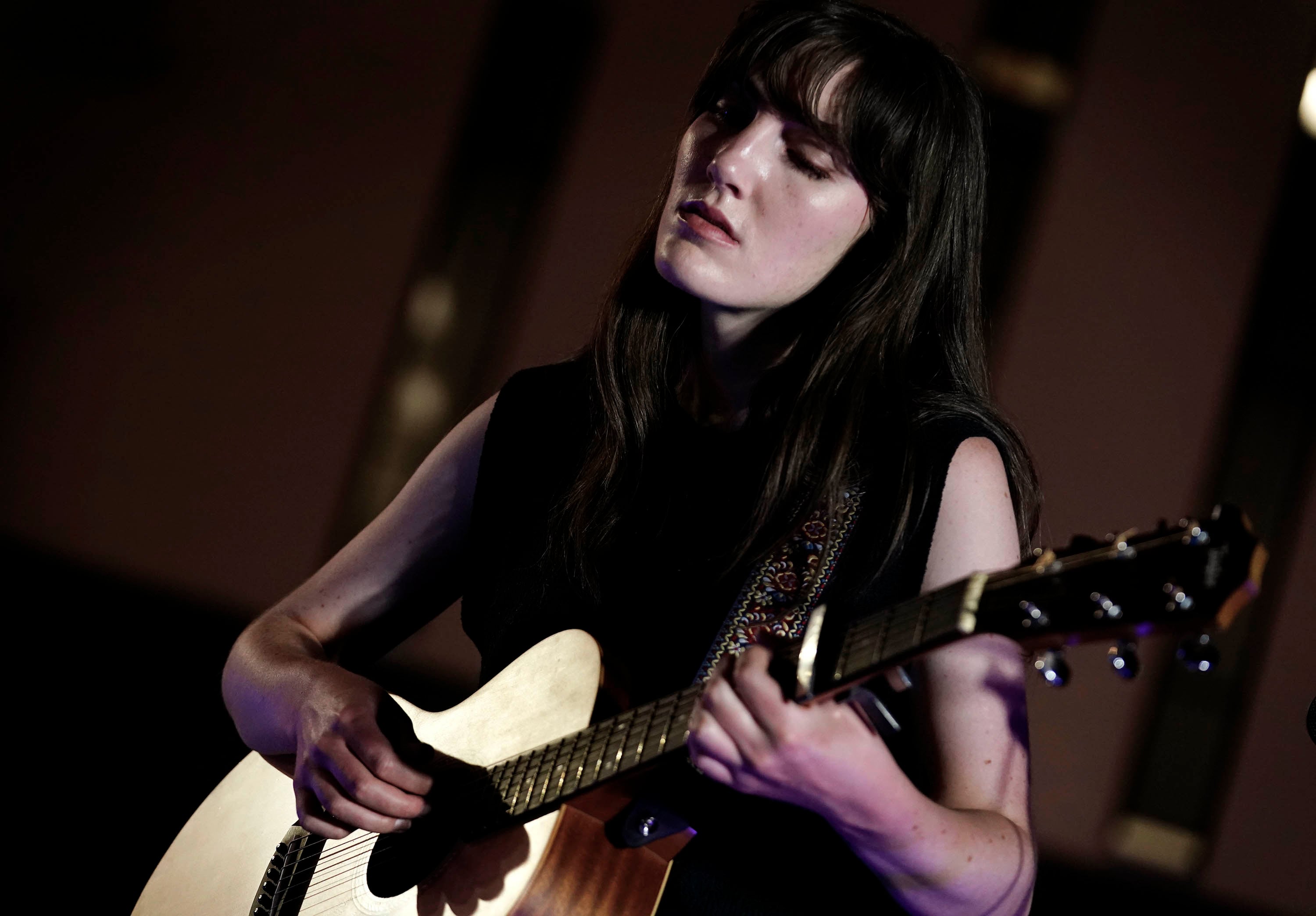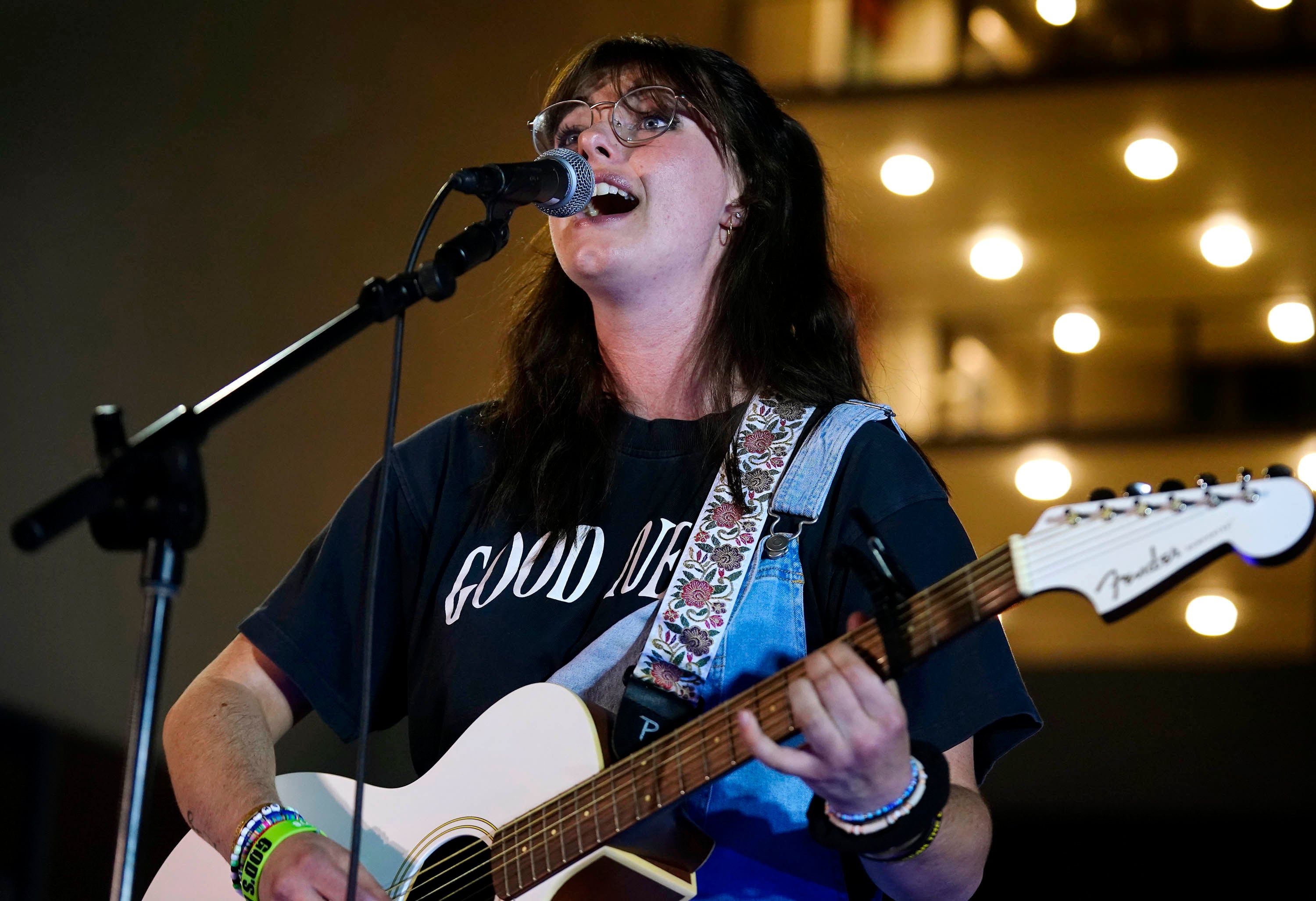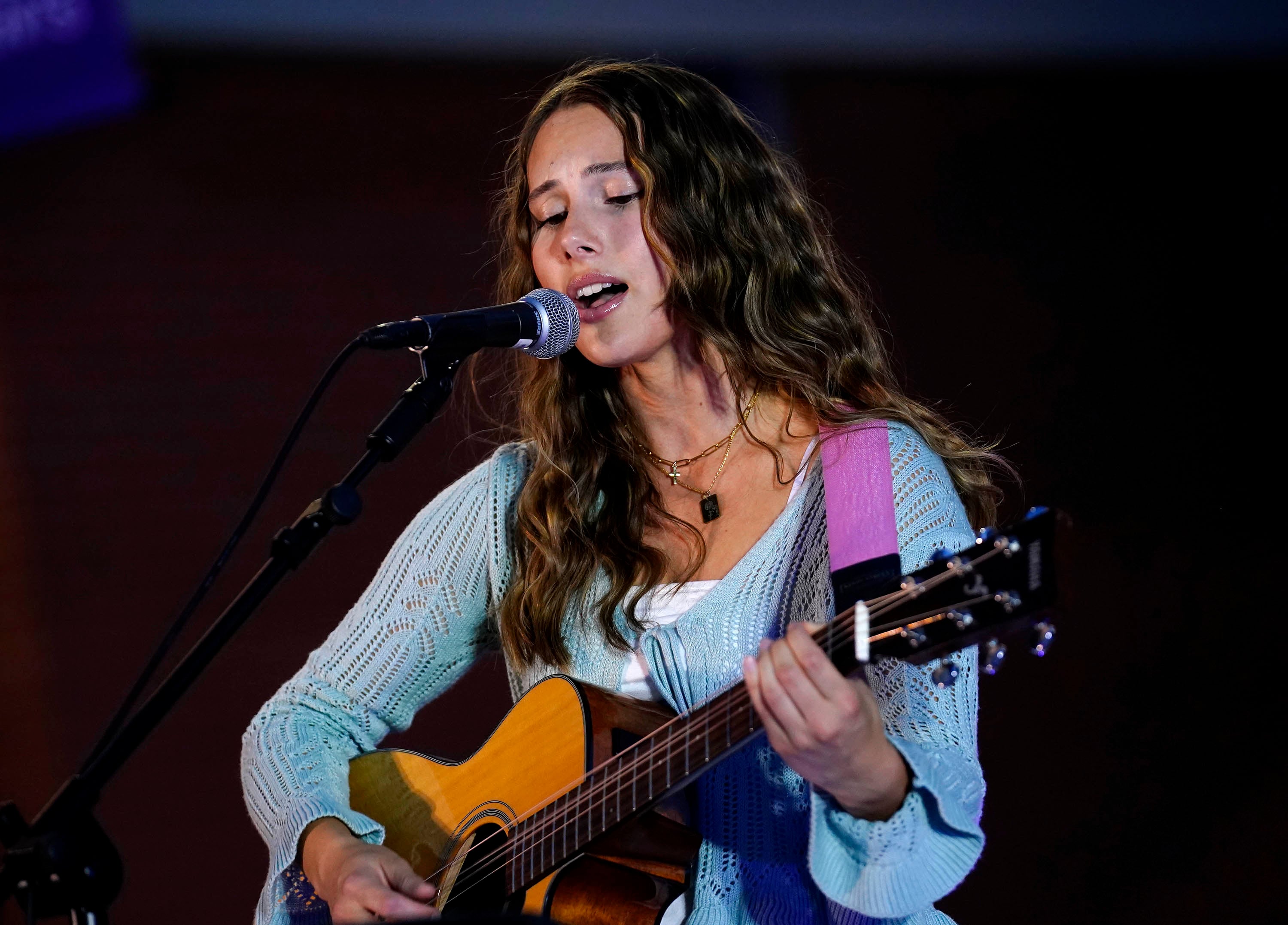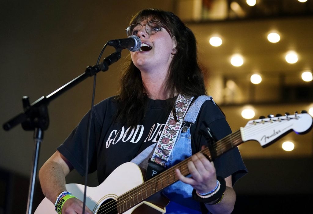 Angelina Olson, performing under the name Angelina Grace, plays guitar on the song “God of All Grace” during the Songwriters Showcase. April 20, 2026. -