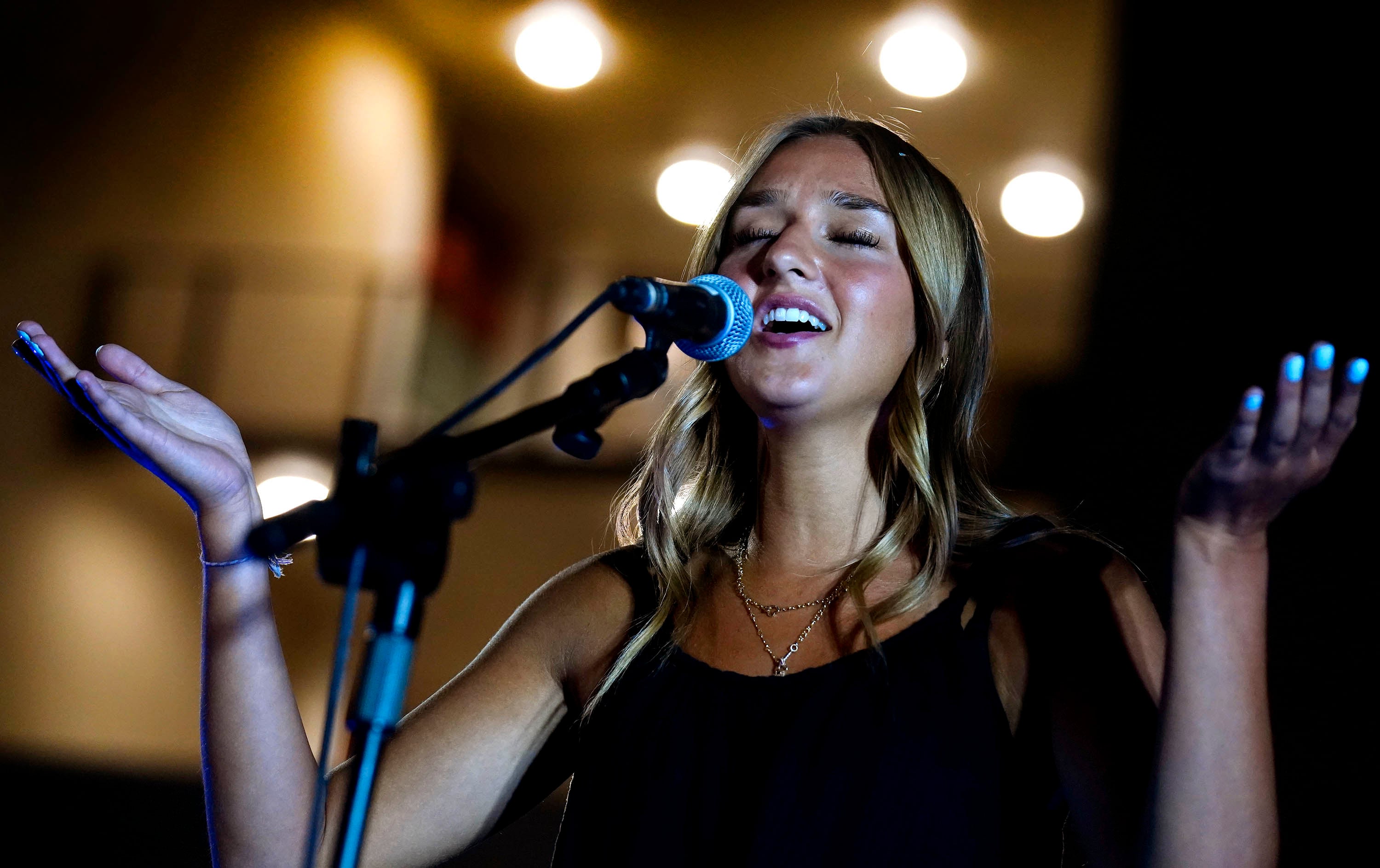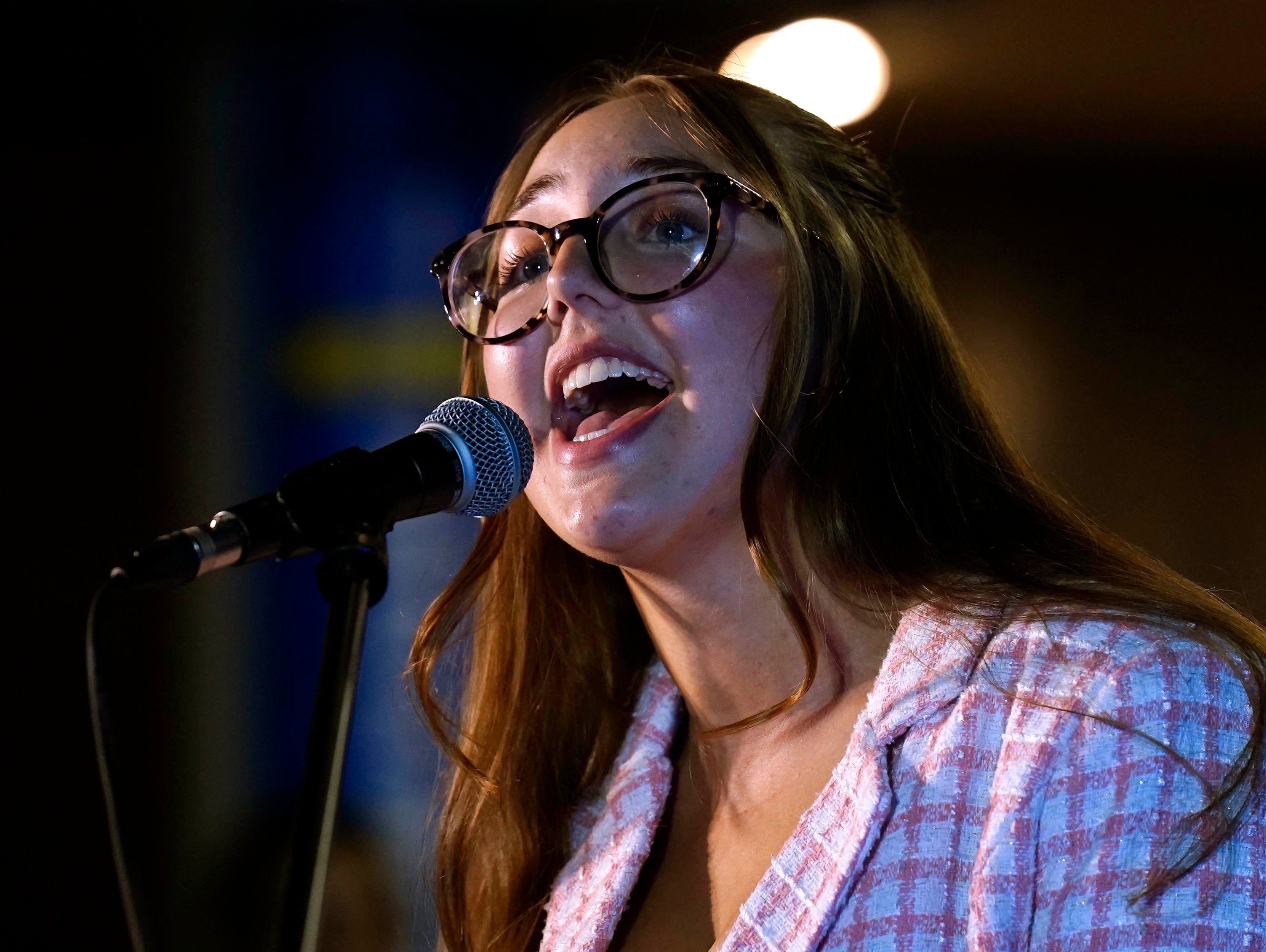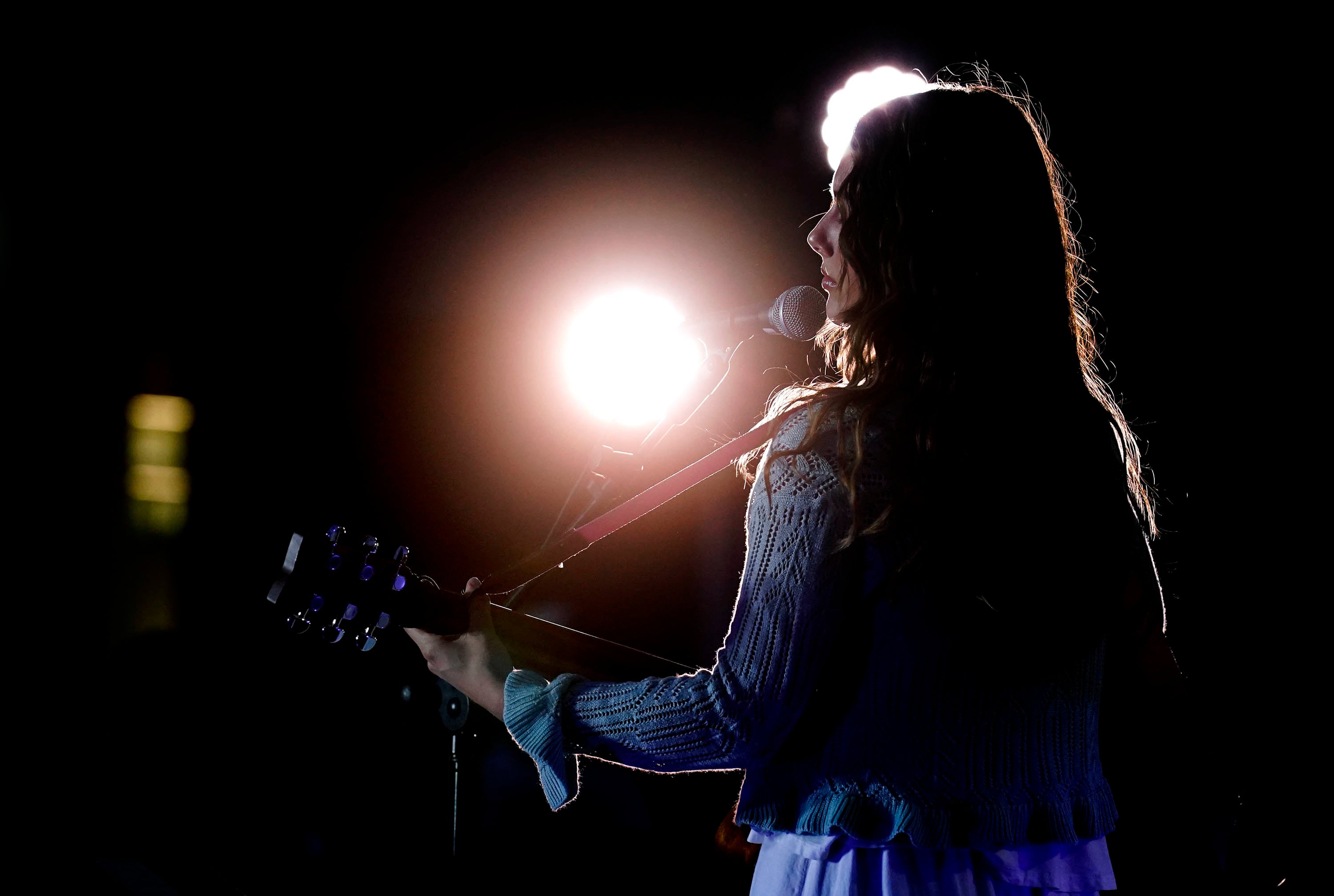 Angelina Olson, performing under the name Angelina Grace, plays guitar on the song “God of All Grace” during the Songwriters Showcase. April 20, 2026. -