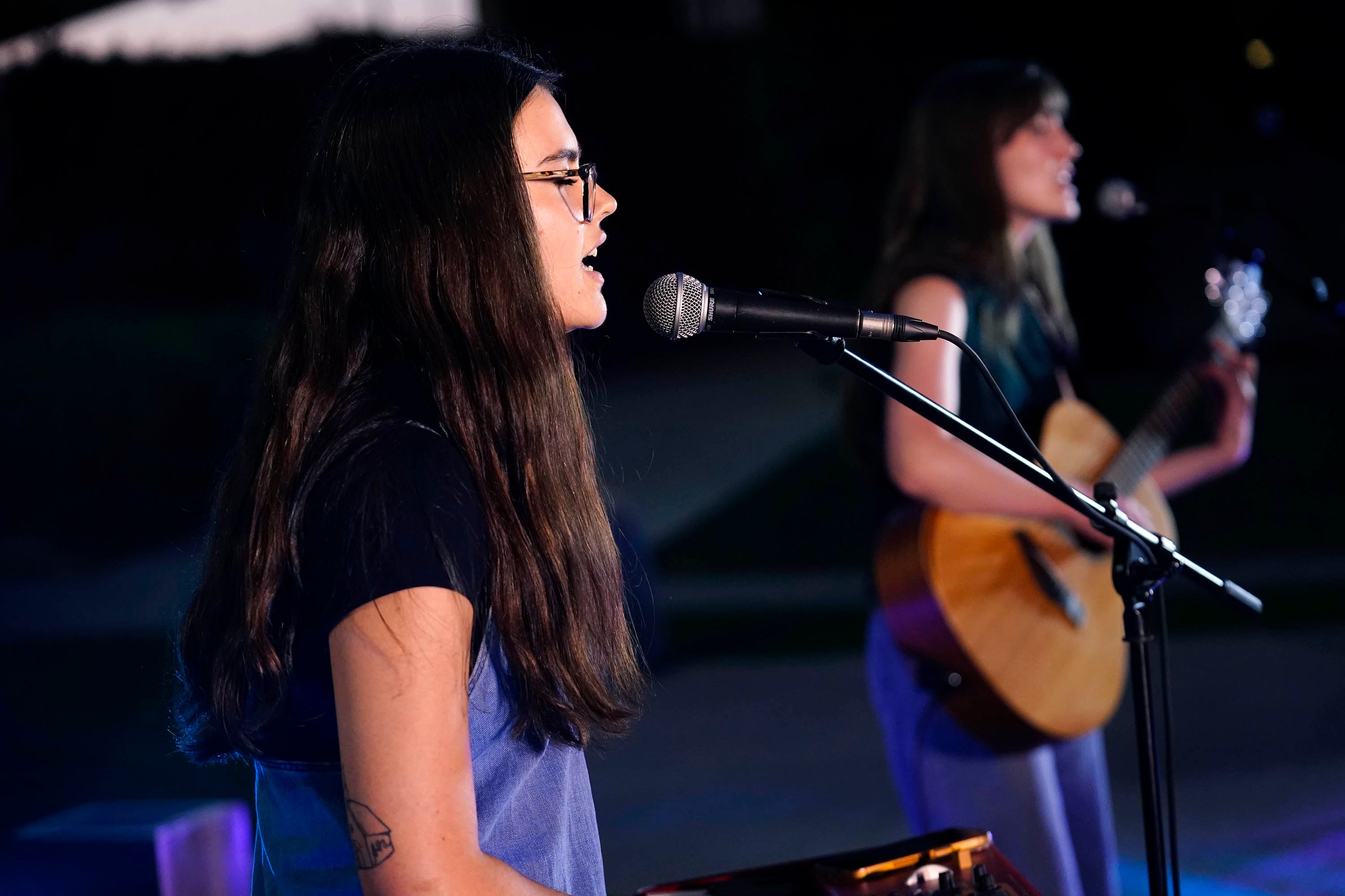 CeCe Bedore (right) and Angelina Olson perform “Come Home Child” during the Songwriters Showcase at the Engineering Building courtyard. April 20, 2026. -