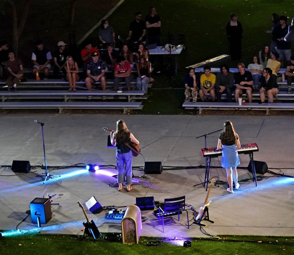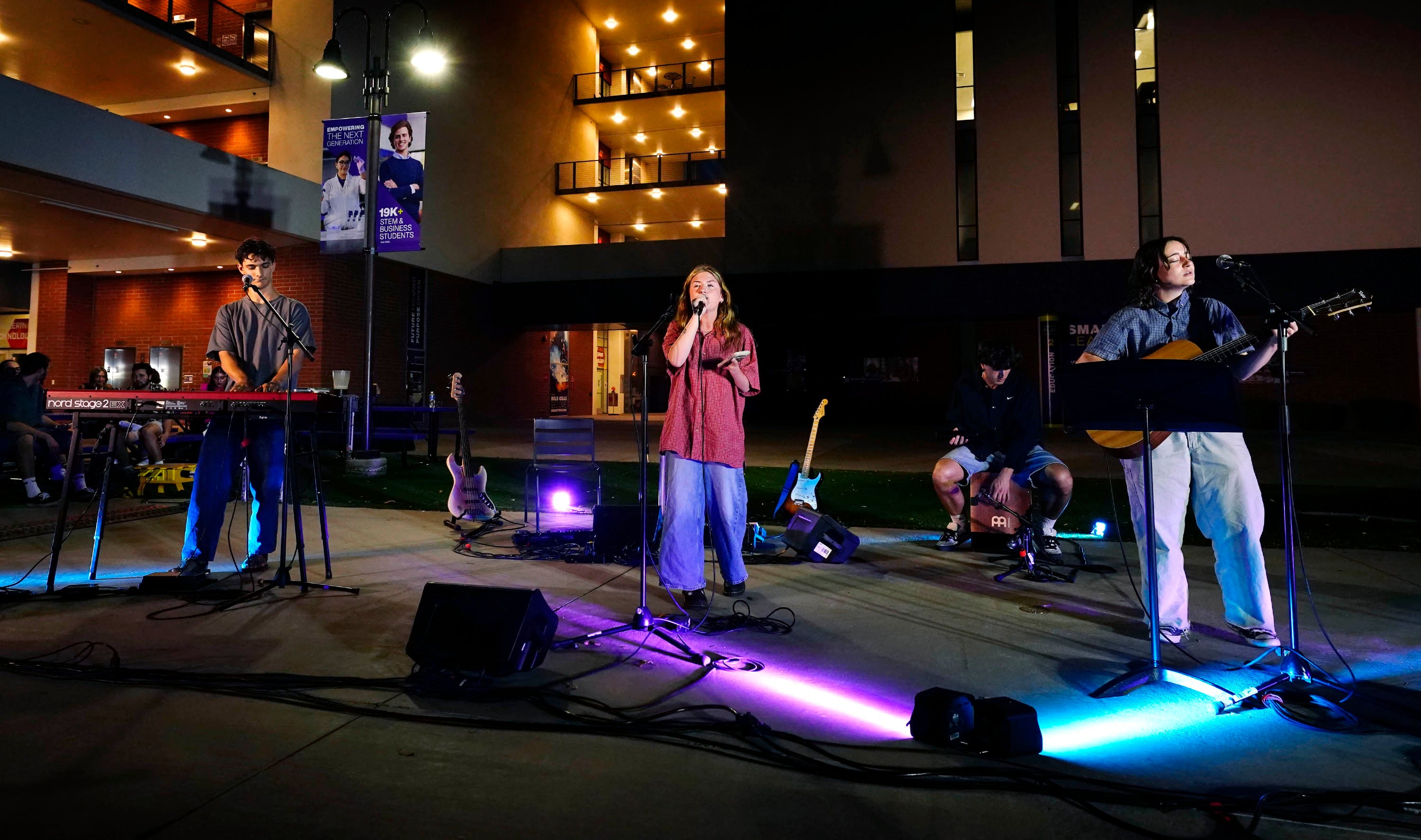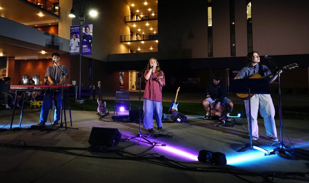 Members of The Grand Collective perform the song “Be My Compass” during the Songwriters Showcase at the Engineering Building courtyard. April 20, 2026. -