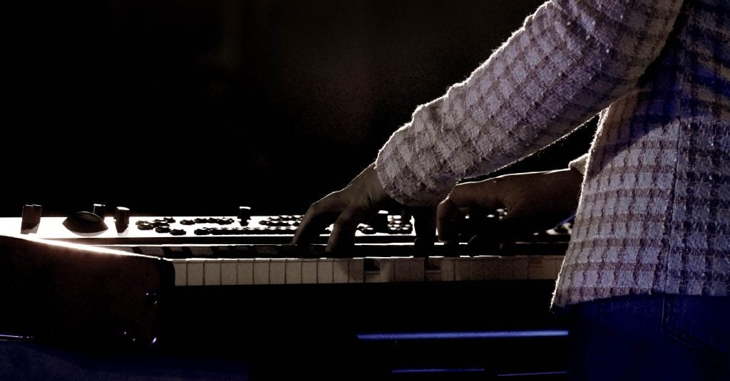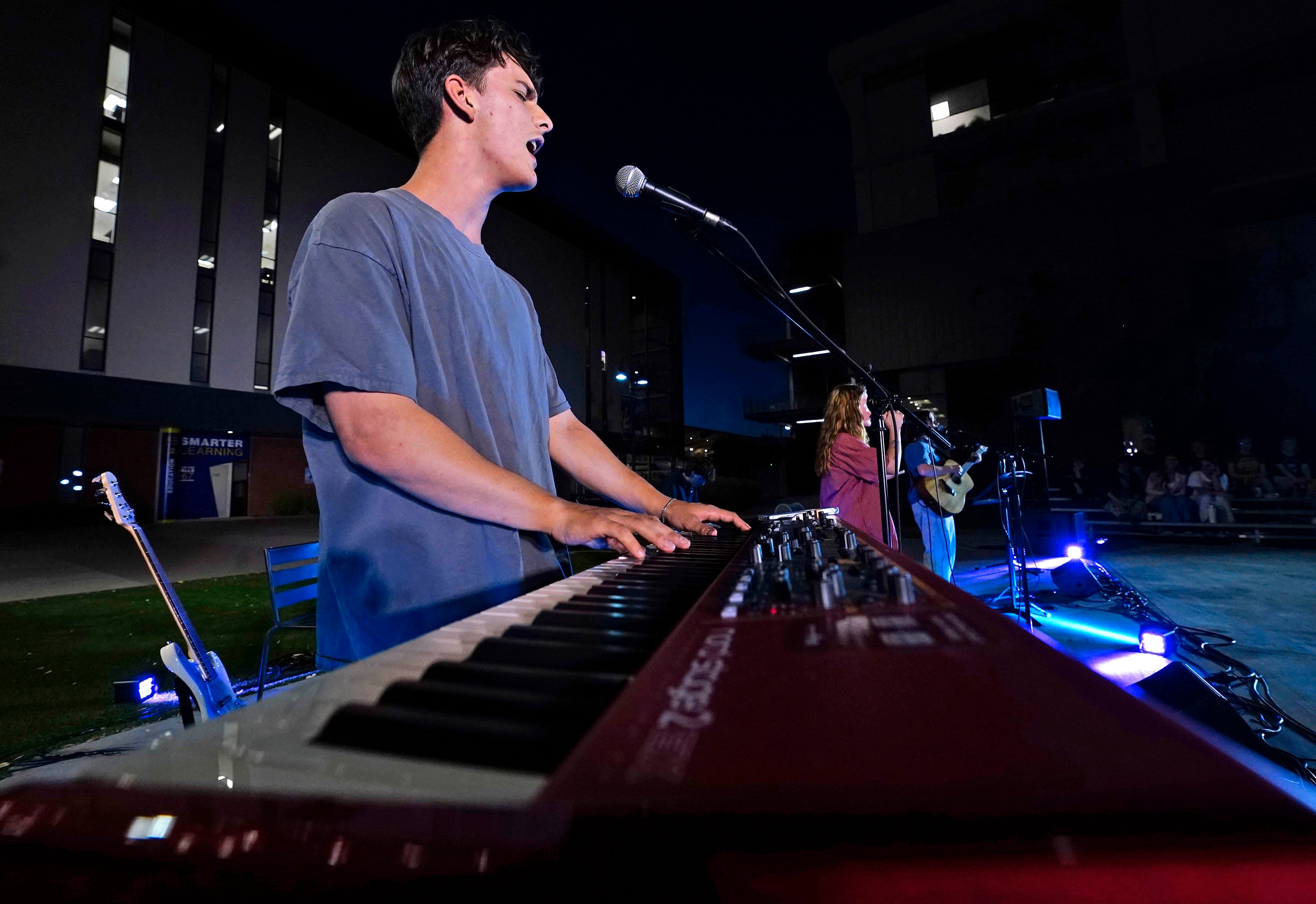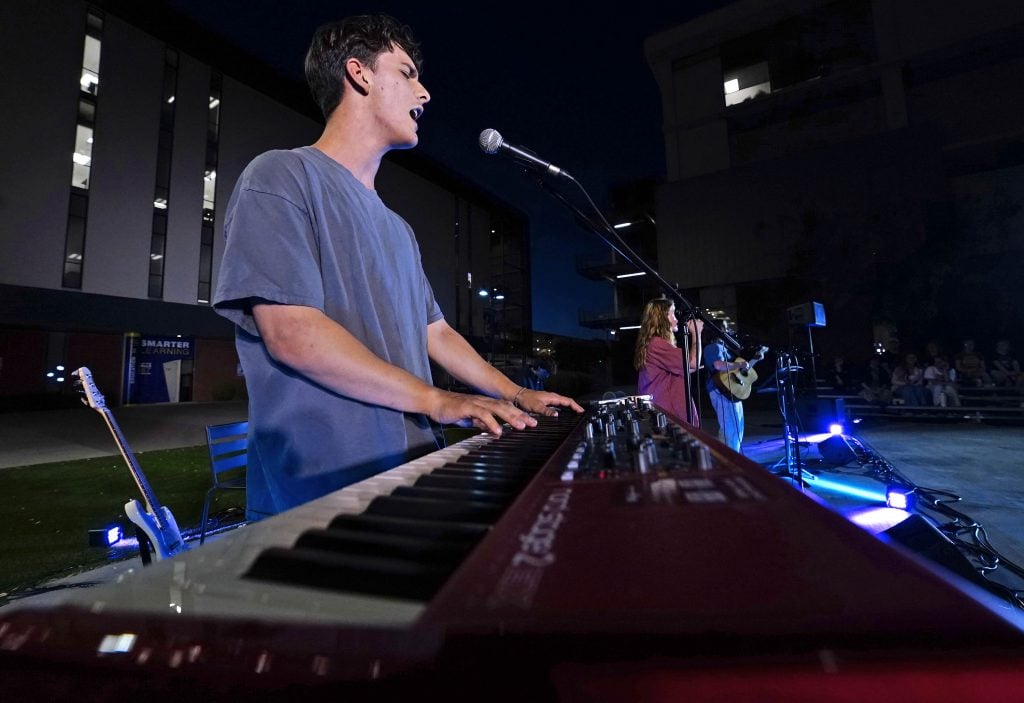 Savannah Rietz plays keyboards as she performs her song “Time After Time” during the Songwriters Showcase at the Engineering Building courtyard. April 20, 2026. -