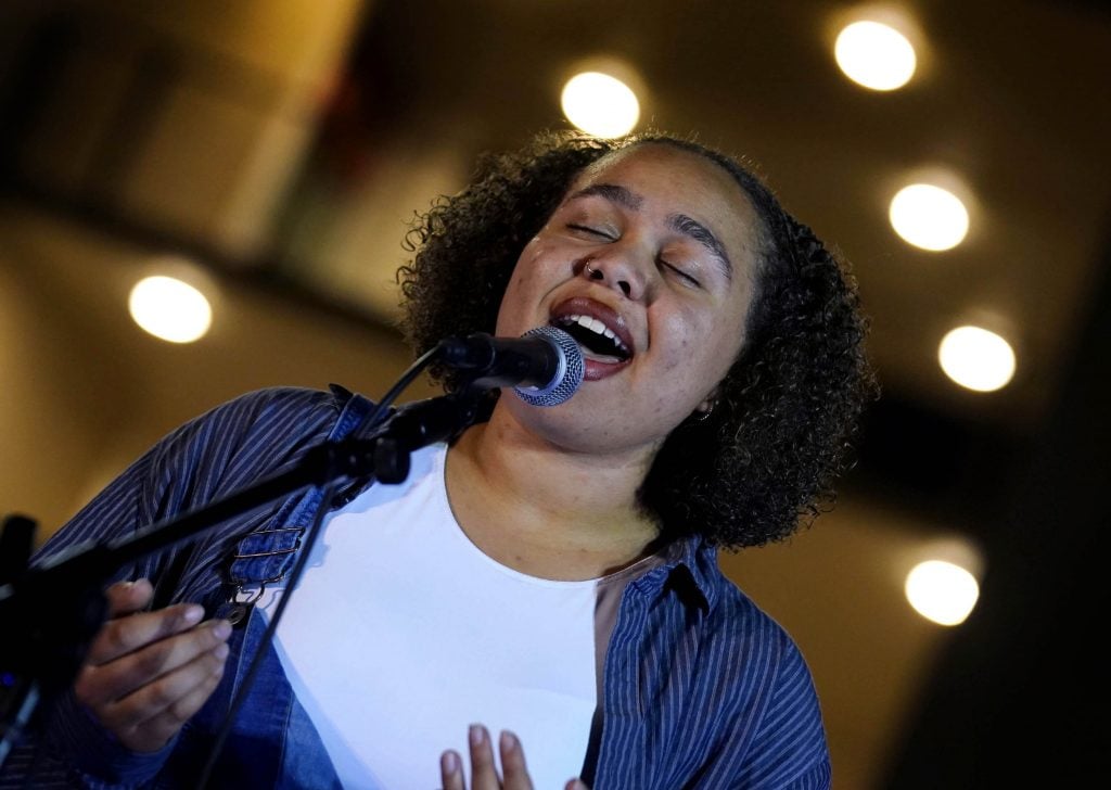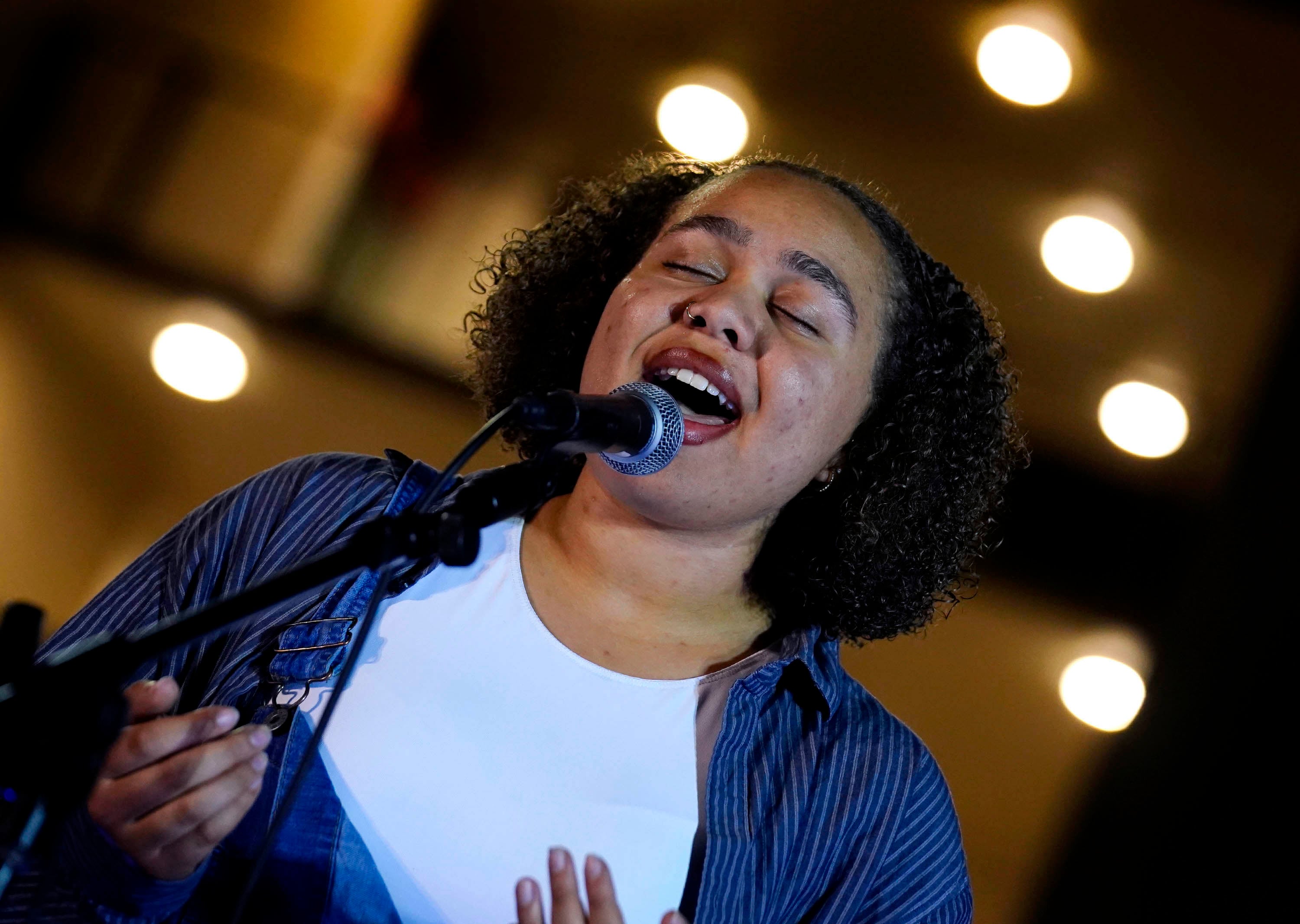 Nevaeh Watkins performs her song “Walk on Water” during the Songwriters Showcase at the Engineering Building courtyard. April 20, 2026. -
