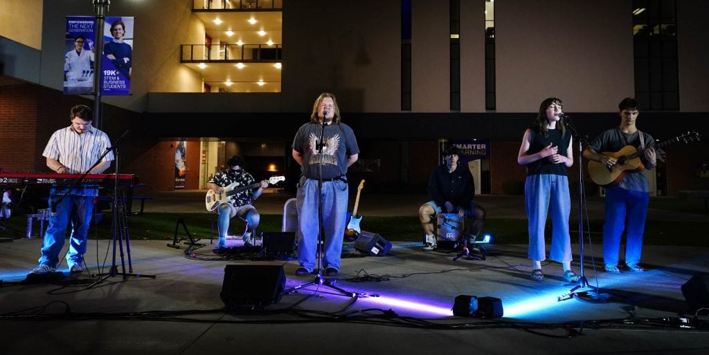 Zach Johnson and The Grand Collective perform the song “What a Beautiful Thing” during the Songwriters Showcase at the Engineering Building courtyard. April 20, 2026. -