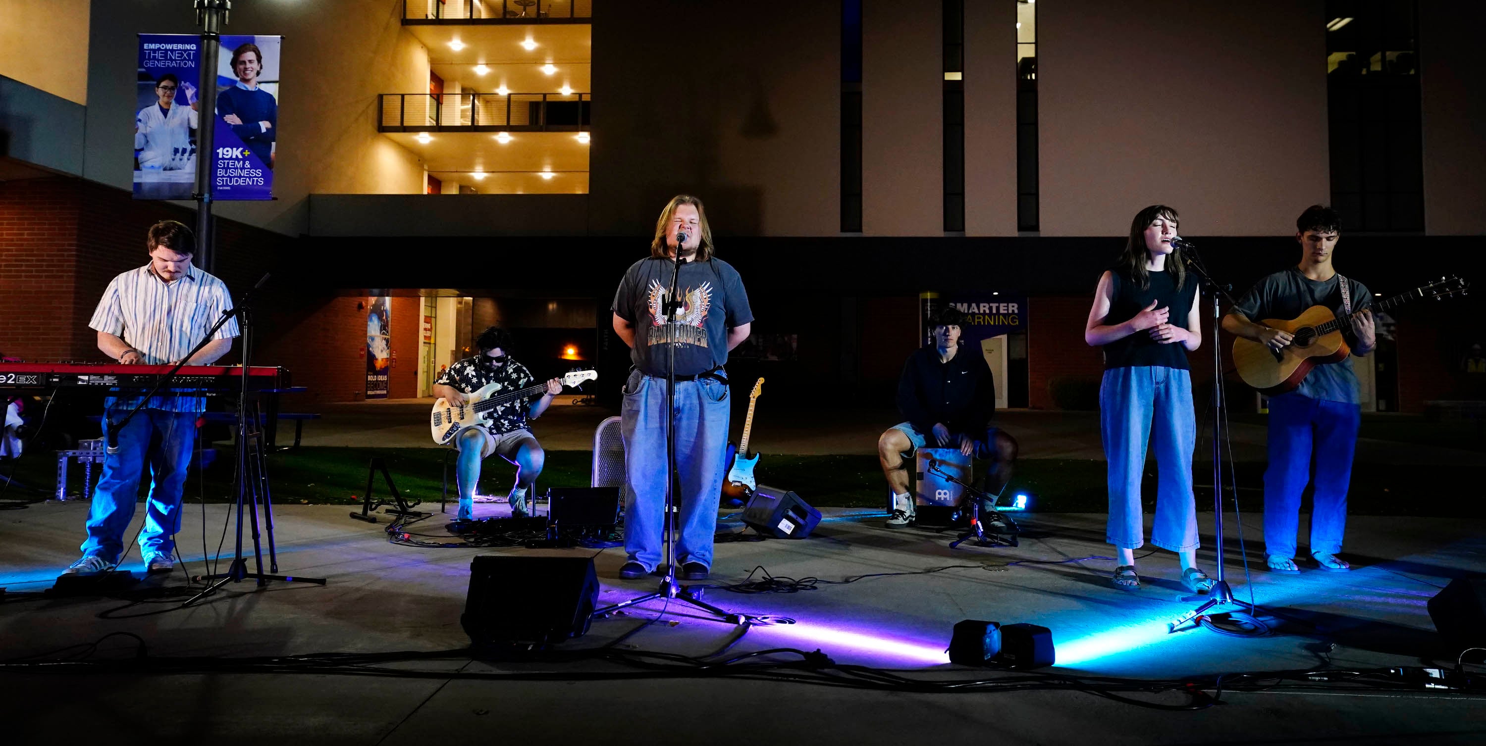 Seventeen songwriters from the worship arts program performed 12 songs Monday night at the Engineering Building courtyard during the spring 2026 Songwriters Showcase. Story