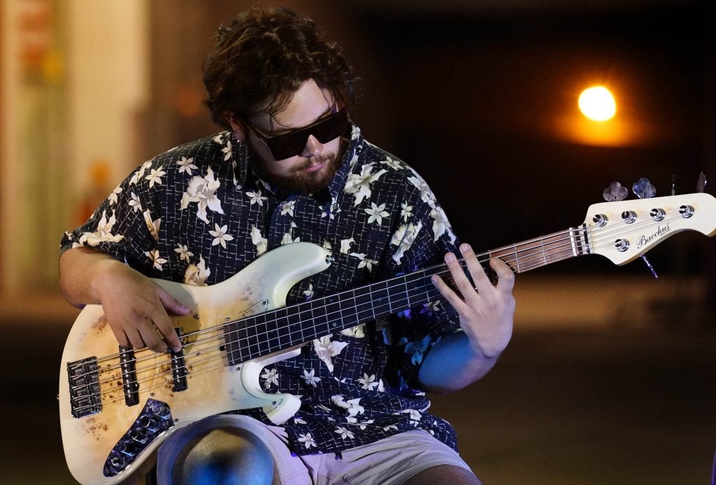 Silas Russel plays bass on the song “Be My Compass” during the Songwriters Showcase at the Engineering Building courtyard. April 20, 2026. -