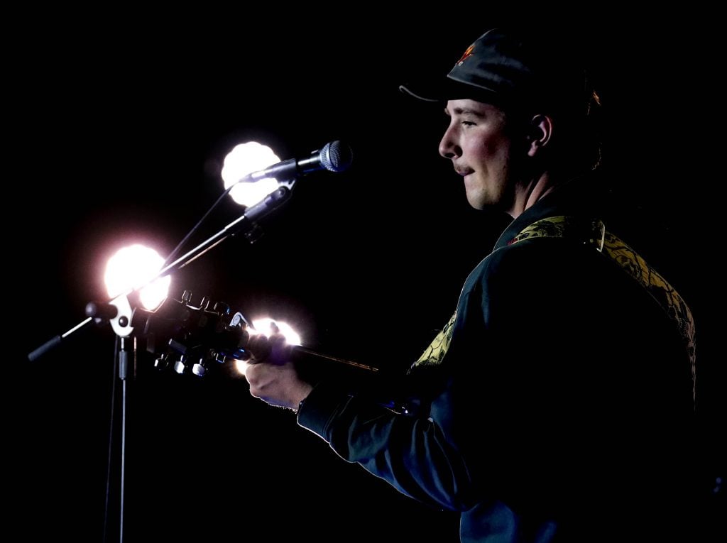 Elijah Zandt performs his song “God Almighty” during the Songwriters Showcase at the Engineering Building courtyard. April 20, 2026. -