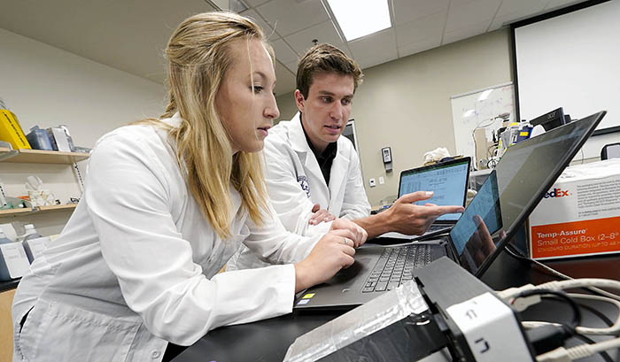 Like a scene from “The Matrix,” Erik Yost and Anna White are in the wet lab in Grand Canyon University’s Natural Sciences Building, watching line upon line of data stream onto a laptop screen.
