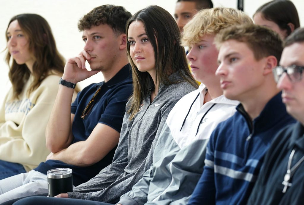 Sports and Entertainment Business Club president Anna Garvert listens to guest speaker Jerry Colangelo during the Colangelo College of Business-sponsored T.W. Lewis Speaker Series at the CCOB lobby. -