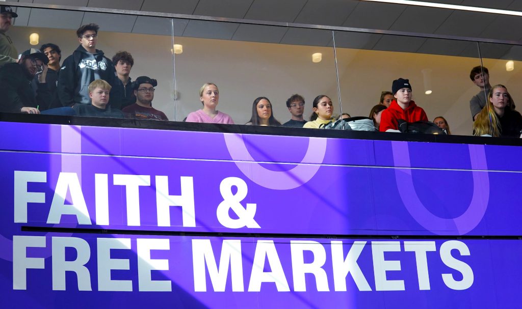 Students watch from the second-floor balcony of the Colangelo College of Business as Jerry Colangelo speaks during the T.W. Lewis Speaker Series event. -