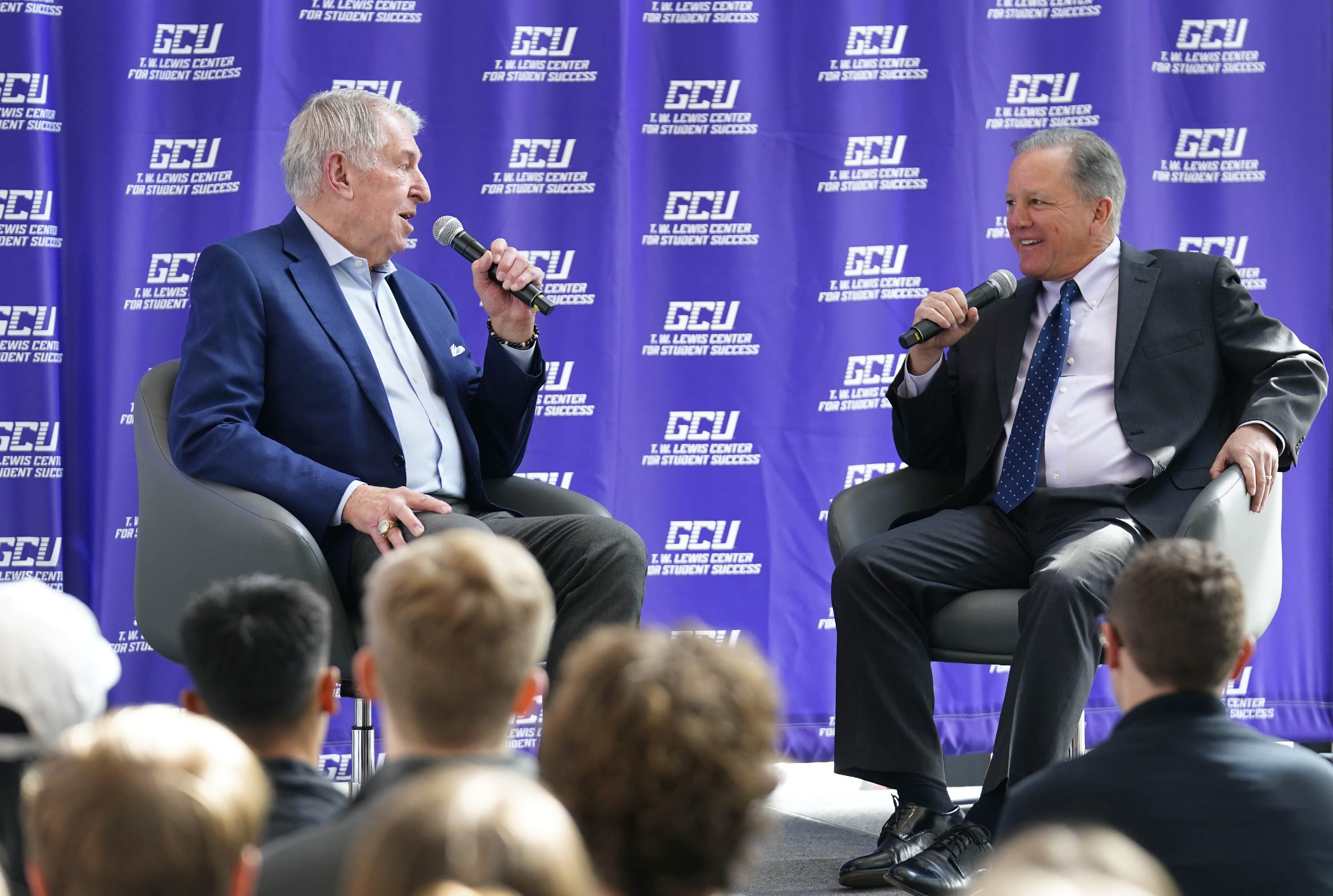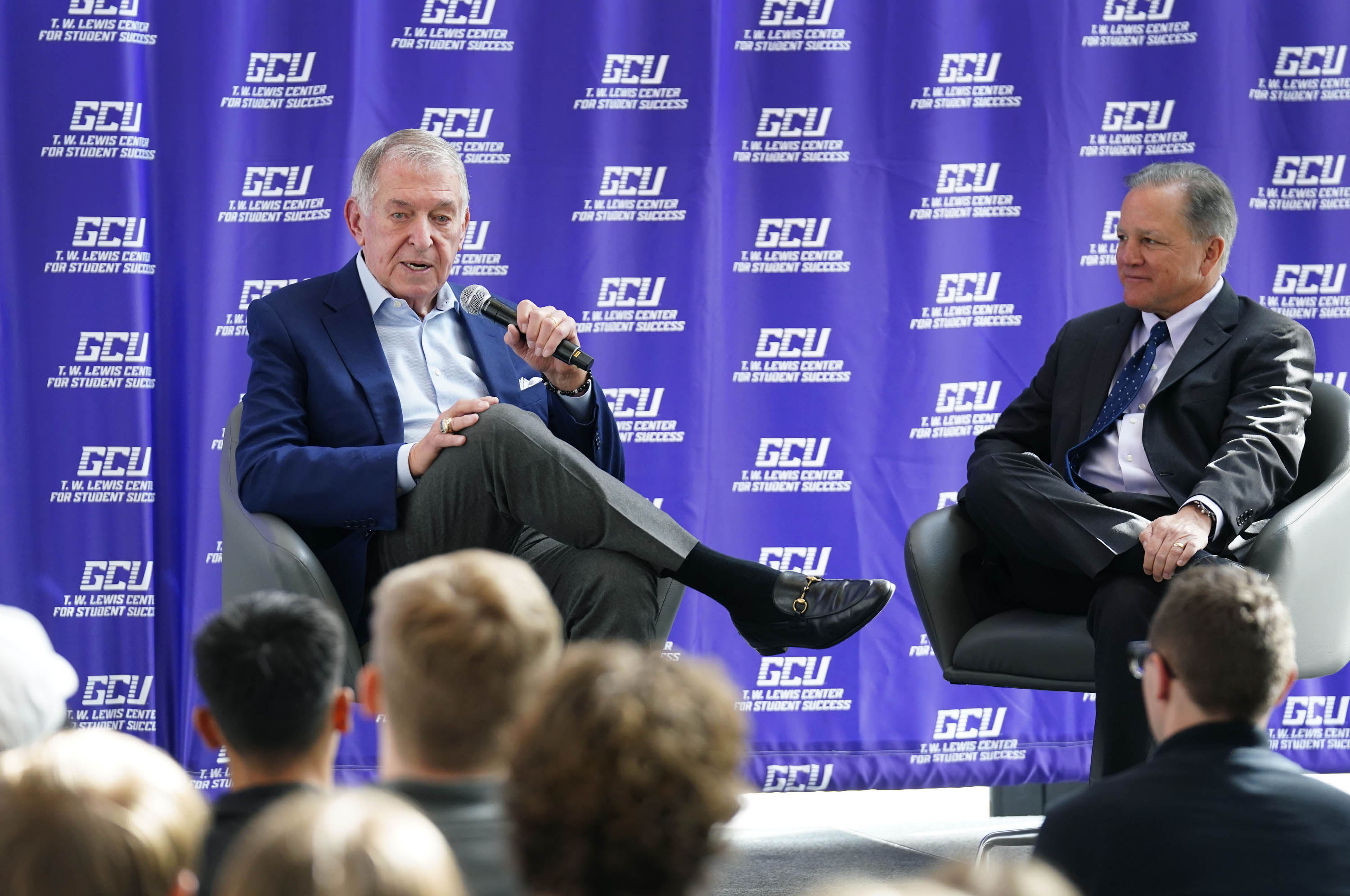 Jerry Colangelo (left) speaks alongside of Colangelo College of Business Dean John Kaites during the T.W. Lewis Speaker Series. -