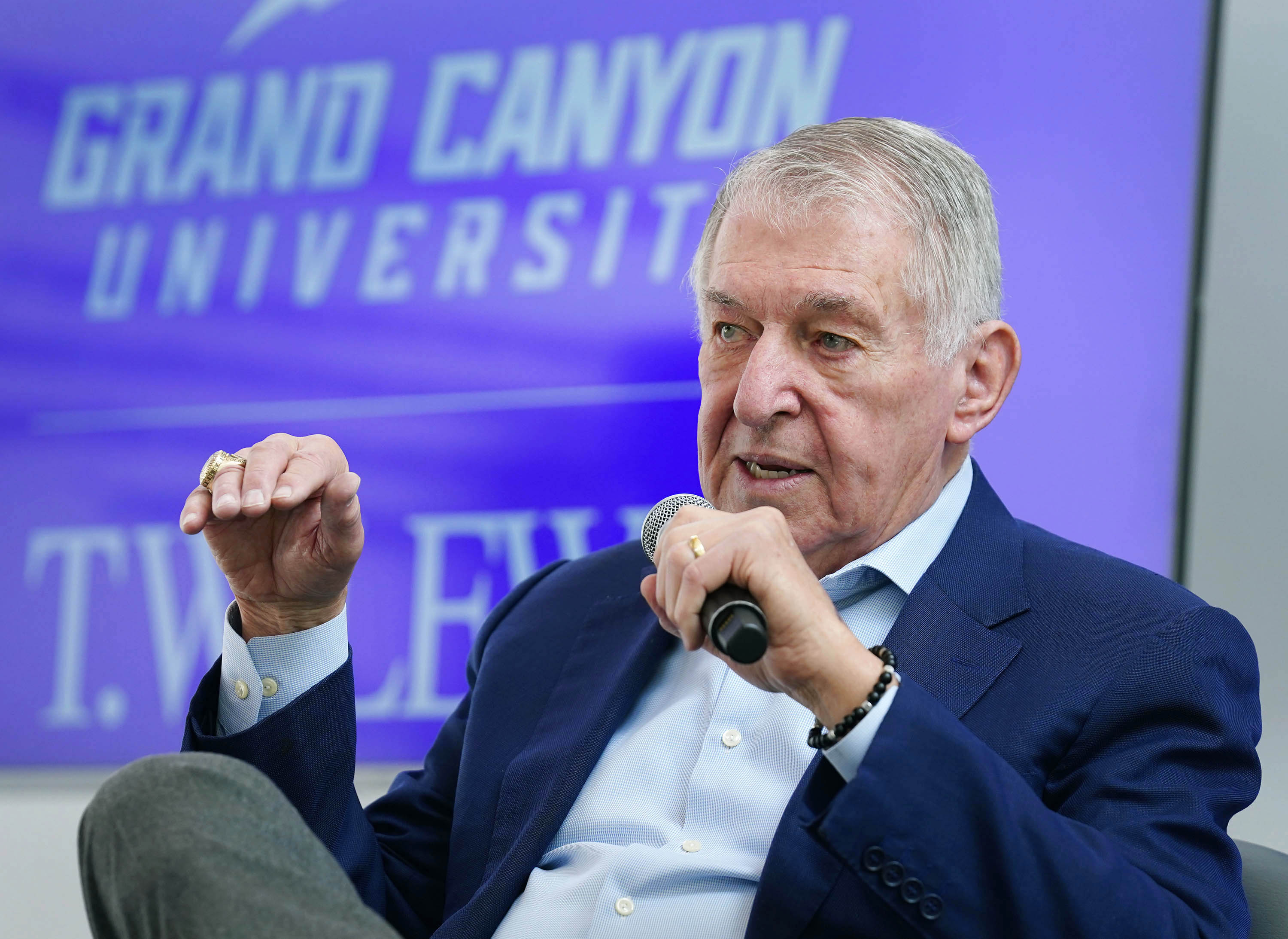 Jerry Colangelo discusses why he didn't leave Phoenix during the Colangelo College of Business-sponsored T.W. Lewis Speaker Series event in the CCOB lobby. -