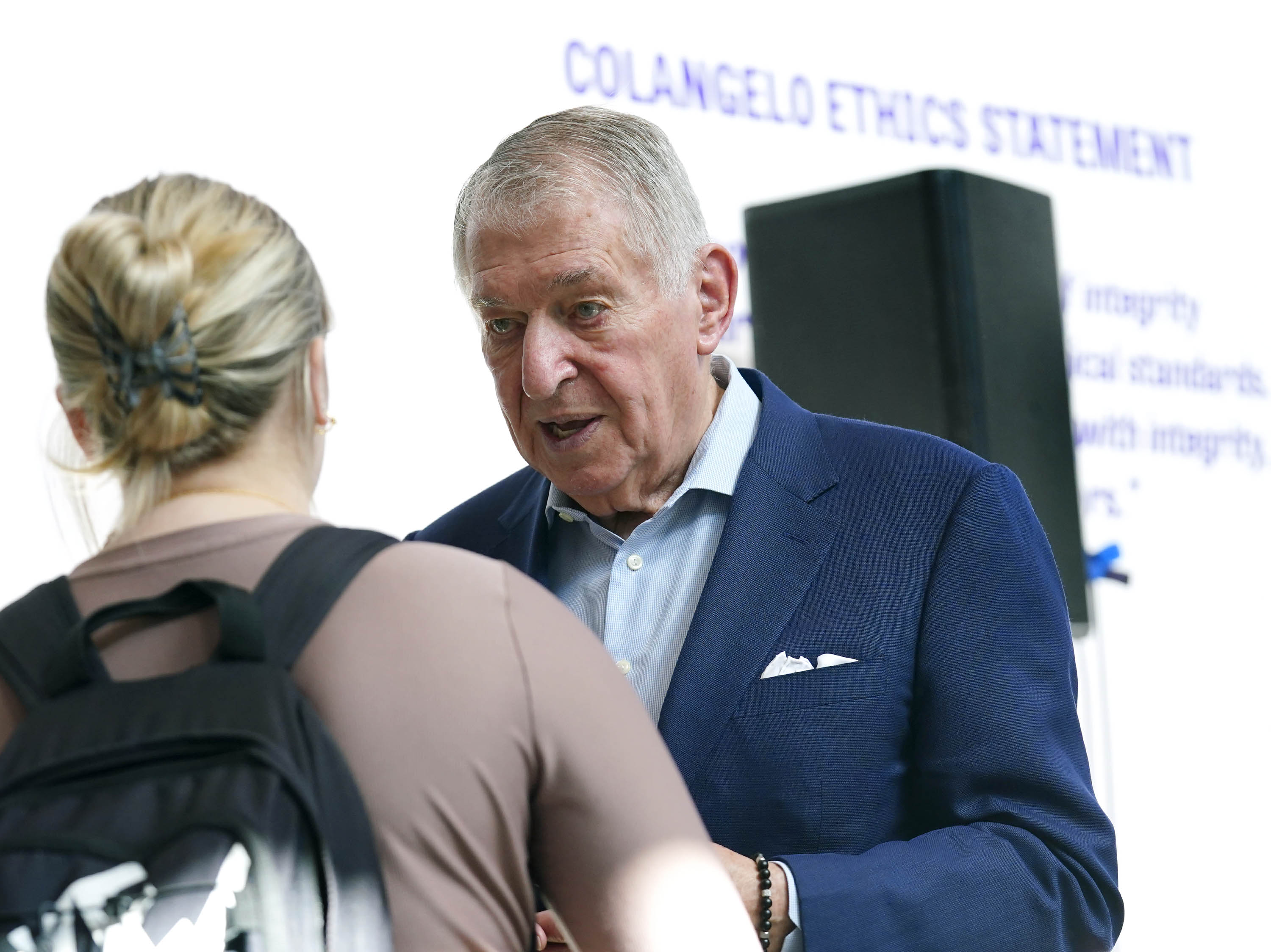 Jerry Colangelo tells students to be good listeners at his T.W. Lewis Speaker Series talk on Thursday in the Colangelo College of Business lobby. -