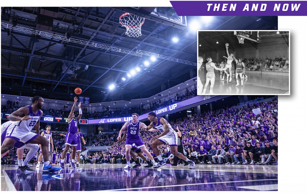 GCU’s spirited fan base has evolved, as seen in these photos of the 1962 men’s basketball team in Antelope Gymnasium and the 2023 team in GCU Arena.