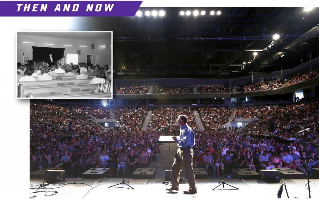 Chapel services have exploded from intimate gatherings in the 1960s to powerful worship and sermon ceremonies of 7,000 faithful students in GCU Arena. -