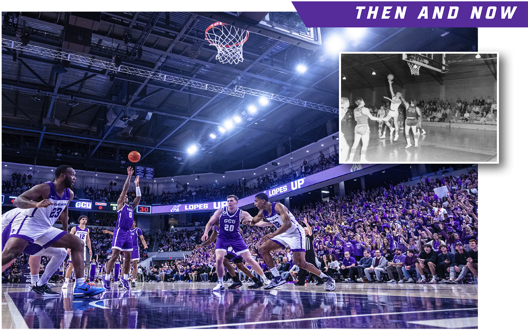 GCU’s spirited fan base has evolved, as seen in these photos of the 1962 men’s basketball team in Antelope Gymnasium and the 2023 team in GCU Arena.