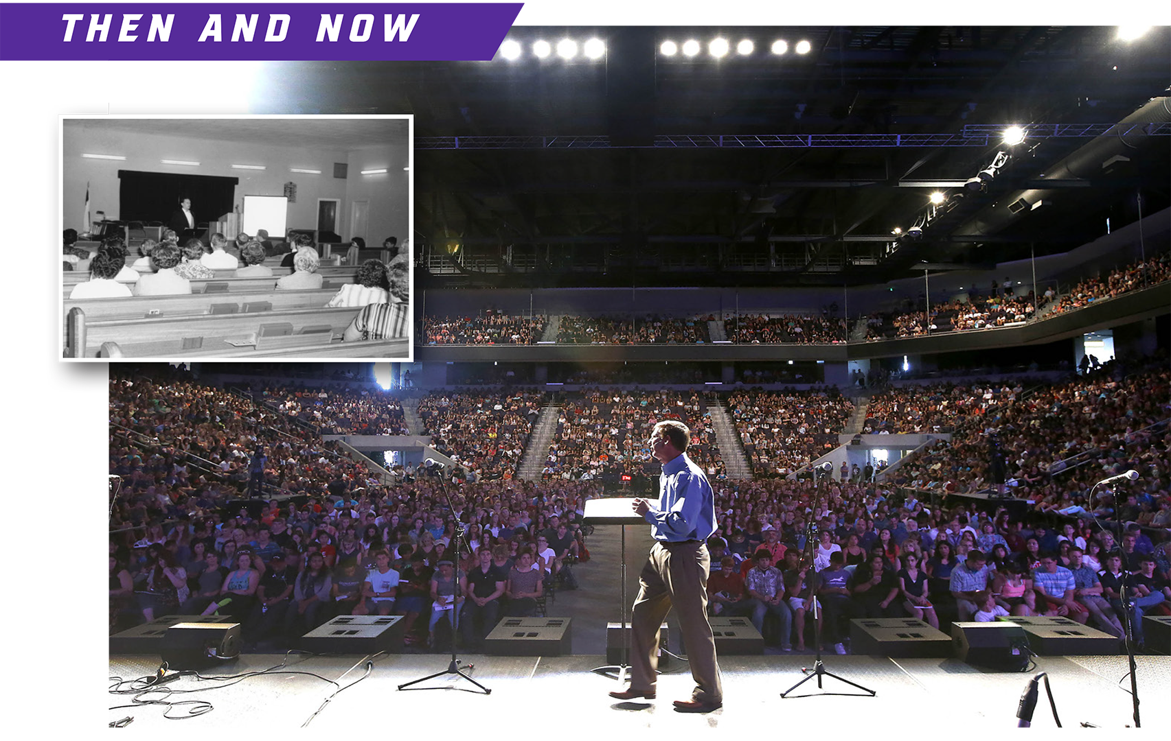 Chapel services have exploded from intimate gatherings in the 1960s to powerful worship and sermon ceremonies of 7,000 faithful students in GCU Arena. -