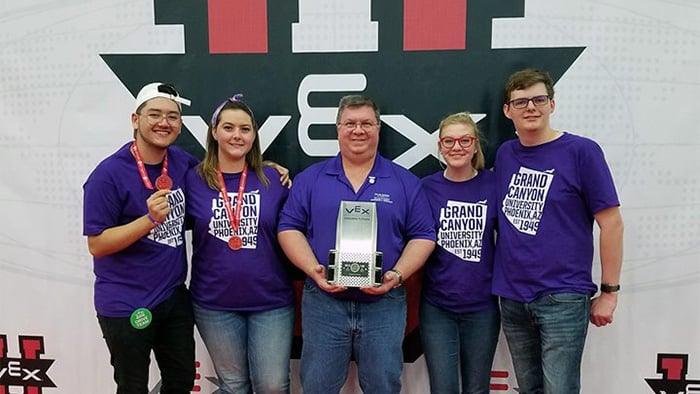 Roman Kim, Makayla Jewell, electrical engineering technology professor Ed Koeneman, Anna Stair and Ryan Pilon (from left) represented Grand Canyon University at the recent VEX World Championship in Louisville, Ky., and came home with the Judges Award.