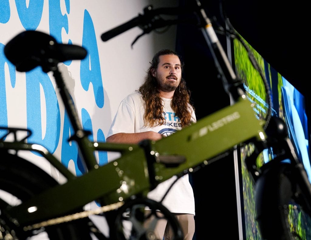 Lectric eBikes co-founder Levi Conlow talks about the company’s newest model e-bike, the XP4 during a special launch event at the company’s Phoenix facility on May 6, 2025.