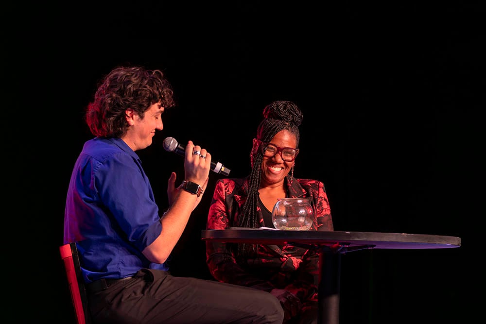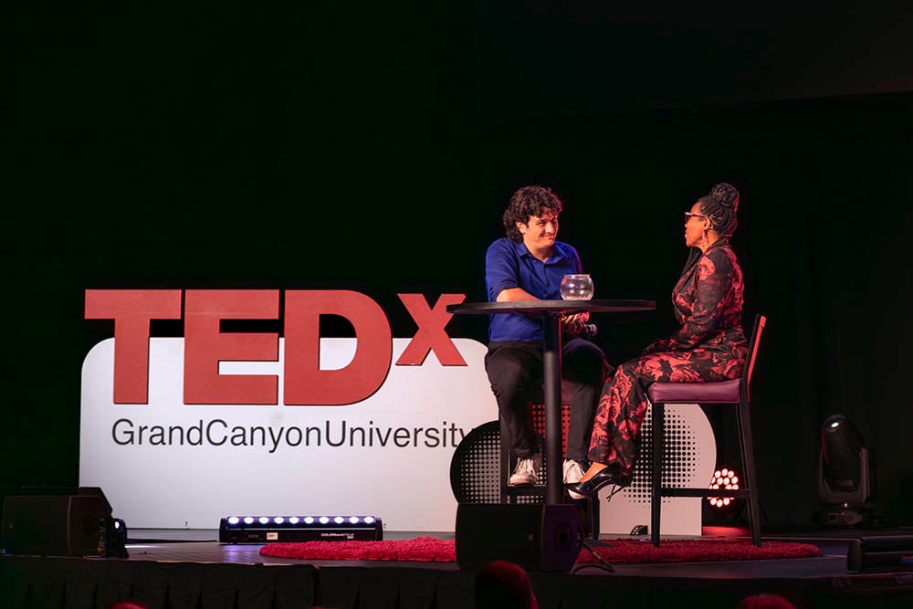 Host Matthew Stout speaks with Dr. Tonya Stafford (right), founder of It's Going To Be OK, a nonprofit advocating better care for survivors of human trafficking, during TEDxGCU. April 10, 2026. -