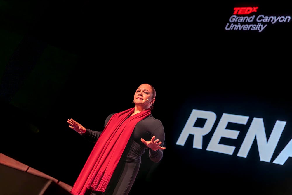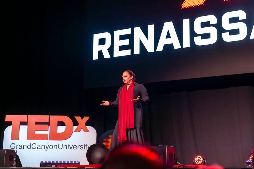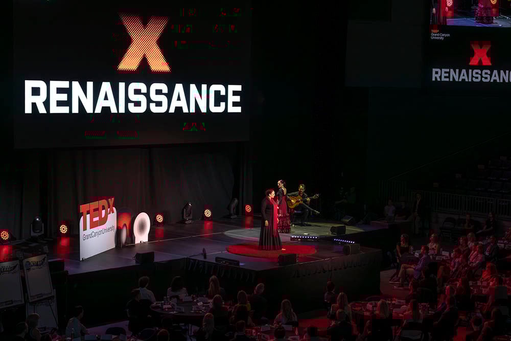Julia Chacon (center) spoke about flamenco and how it bridges communities at TEDxGCU in Global Credit Union Arena. April 10, 2026. -