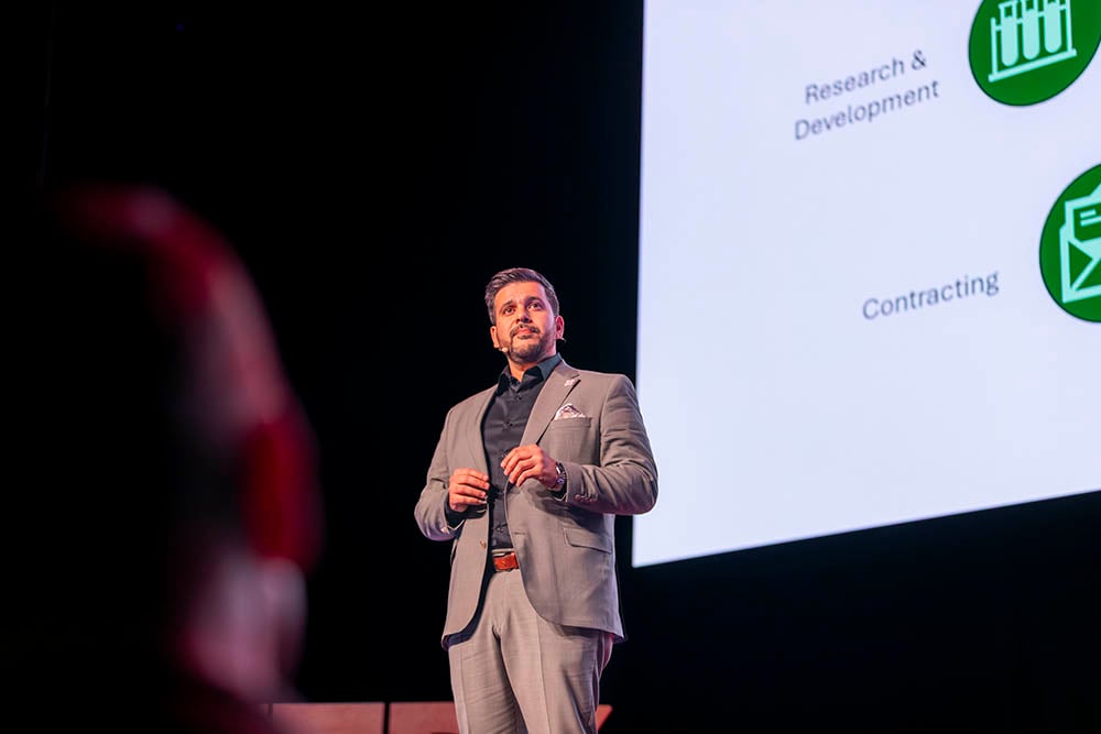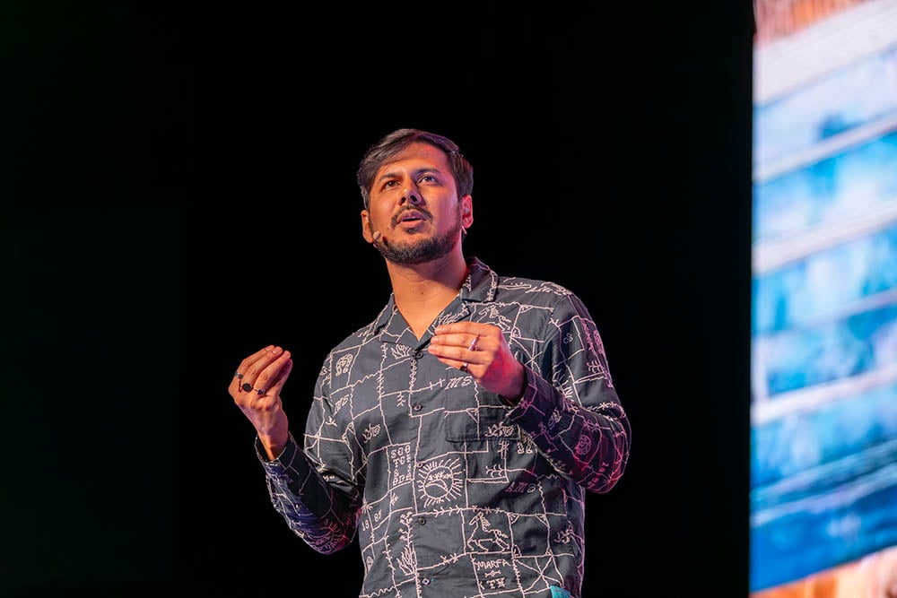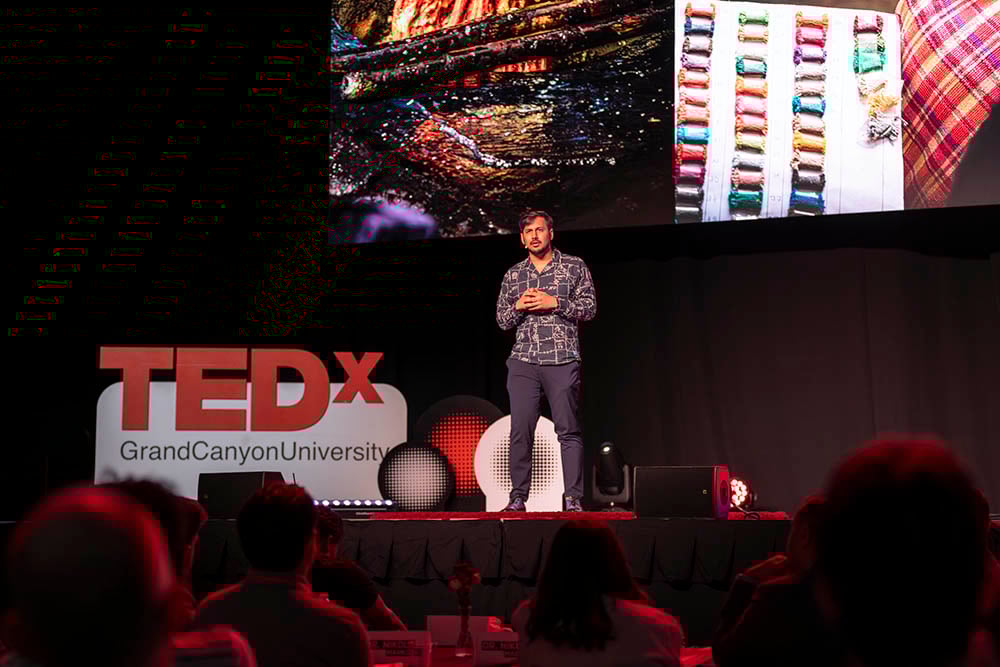 Hammad Abid, a fifth-generation textile designer, asks, "What if a Fabric Could Hold a Memory?" during TEDxGCU on Friday at Global Credit Union Arena. April 10, 2026. -